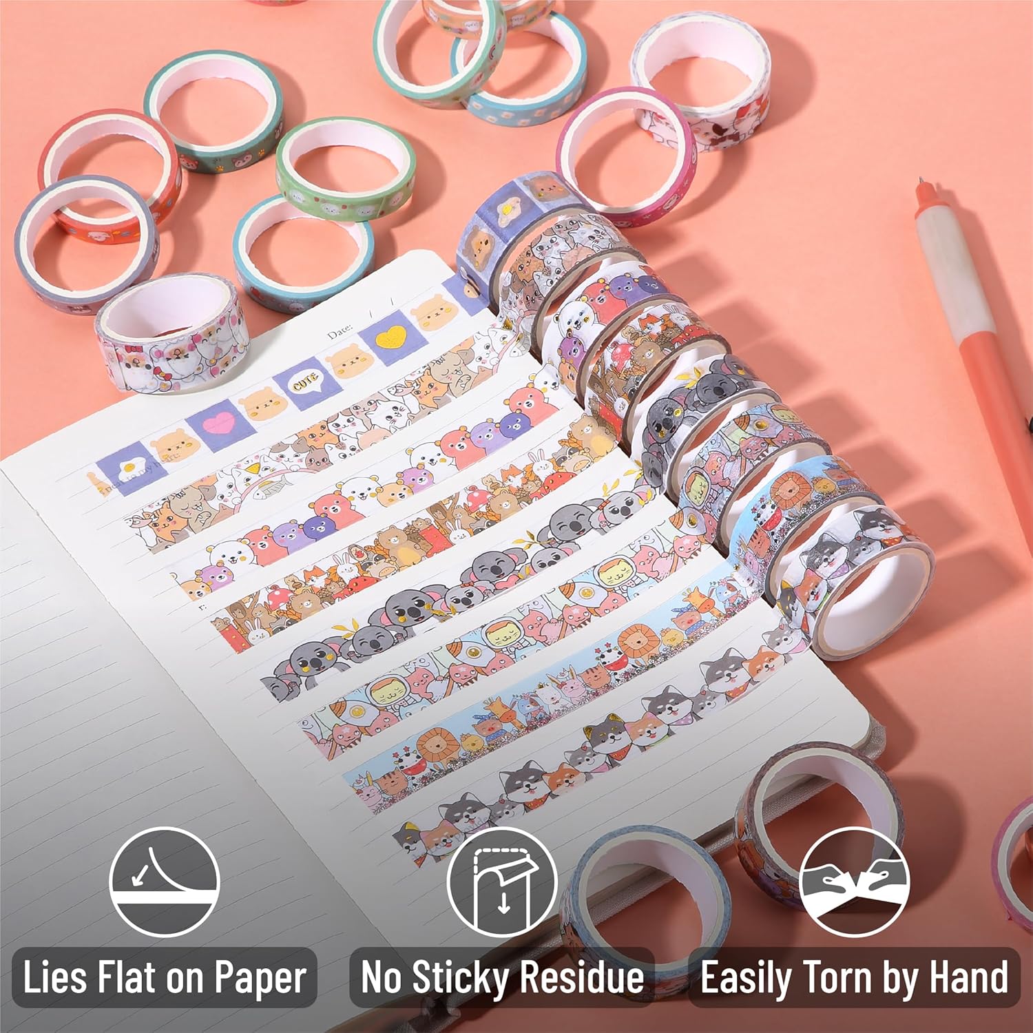 - Made from high-quality, easy-to-tear paper material, these washi tapes are durable, repositionable, and leave no sticky residue, making them ideal for decorating planners, scrapbooks, and journals.