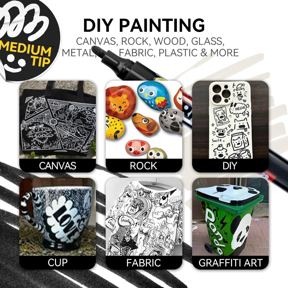 TRANSON Black and White Permanent Paint Markers for Fabric Rock Craft Diy Painting Medium Tip Oil Based Waterproof