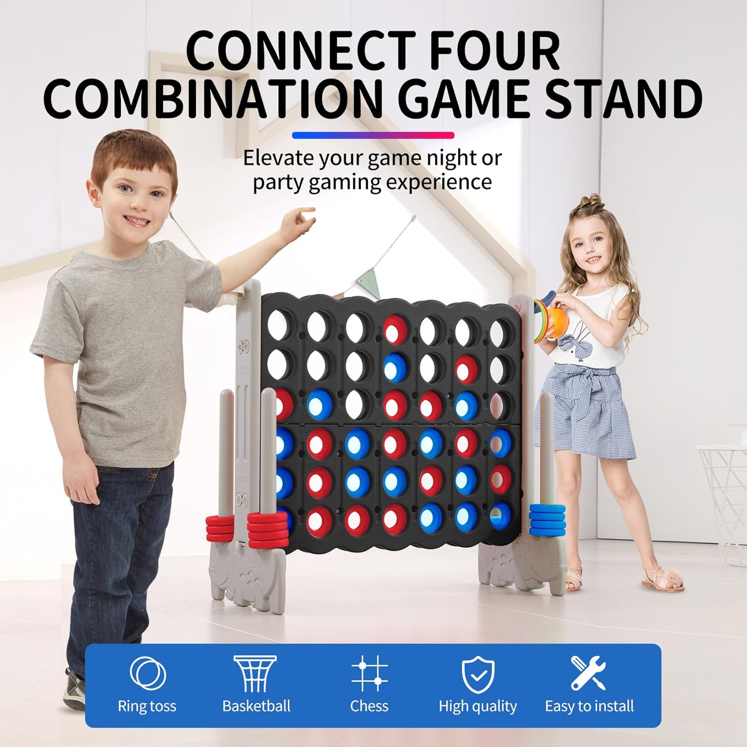 UNICOO Giant 4-in-A-Row with Carry Bag, Ring Toss, Basketball Hoop - Large Outdoor Game for Family Fun - Big Jumbo Game Set for Backyard Parties, BBQs, and Gatherings (Black & Grey)
