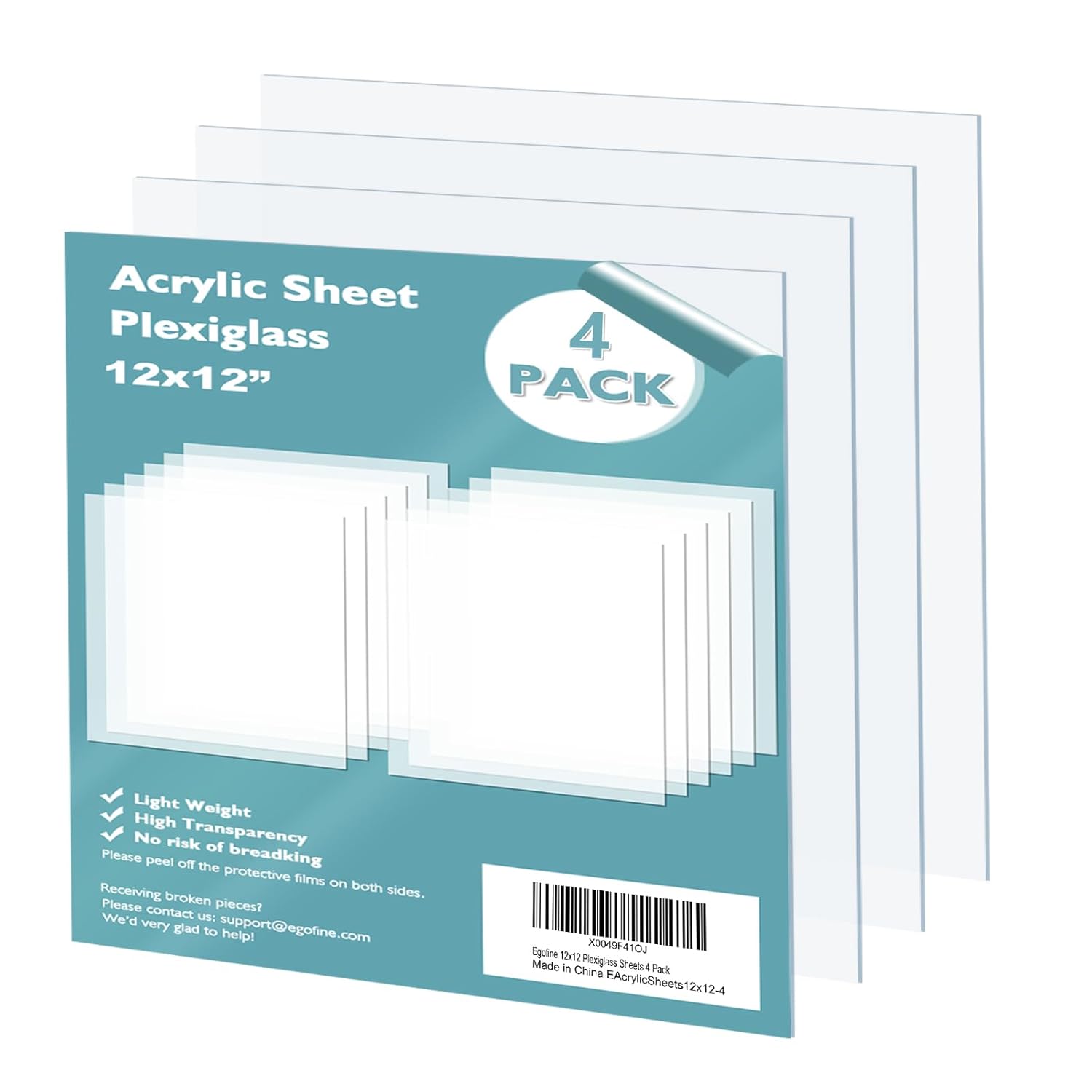 Egofine Plexiglass Sheets Acrylic Sheets 4 Pack of 12x12’’ 0.04 Thick Clear Plastic Cast Transparent Plexi Glass for Crafting Projects, Replacement Picture Frame Glass, DIY Display, Easy to Cut