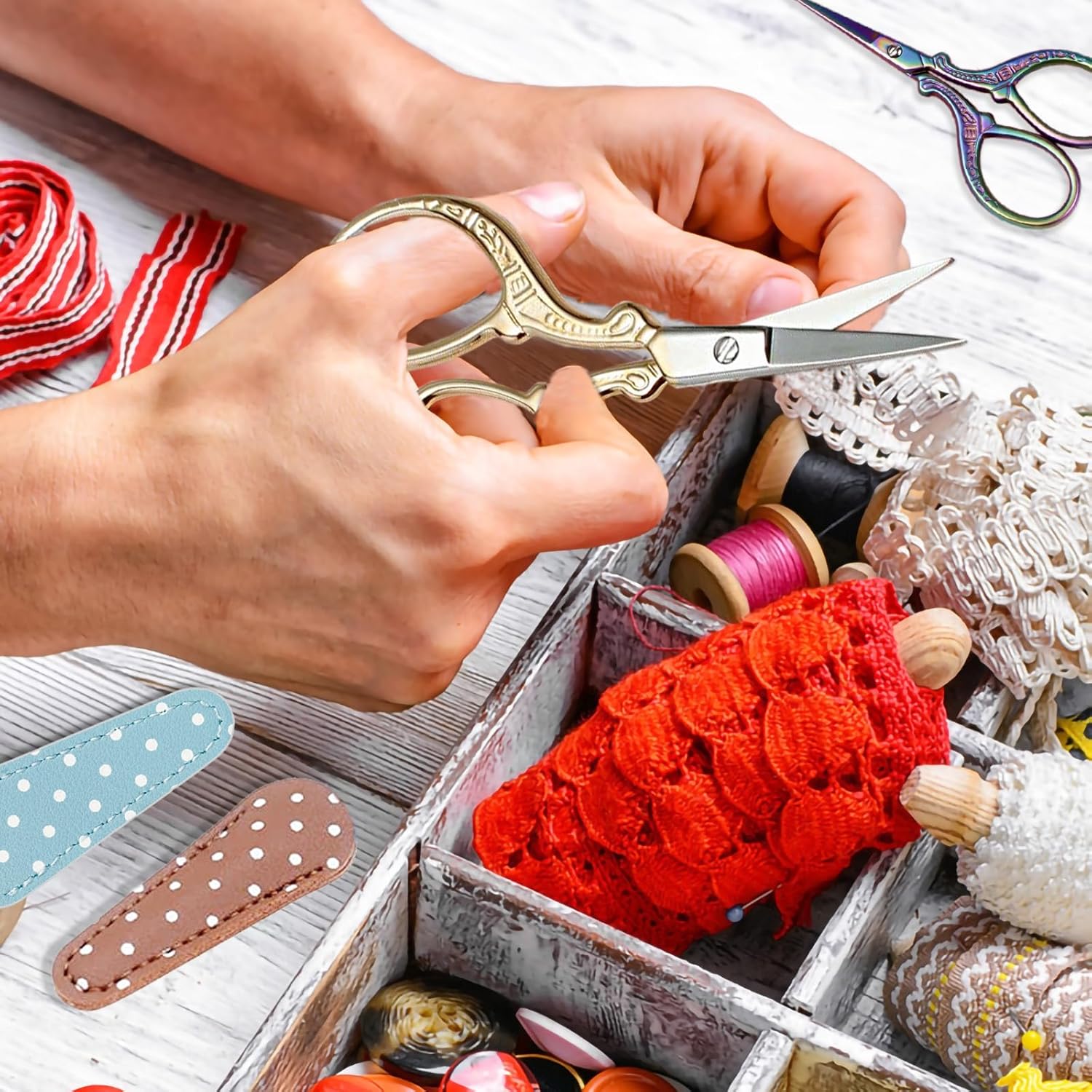 - Package of scissors:small sewing scissors and leather scissors safe cover. suitable to be as a delicate gift for friends or families who love embroidery, DIY working, and keep children away from scissors.