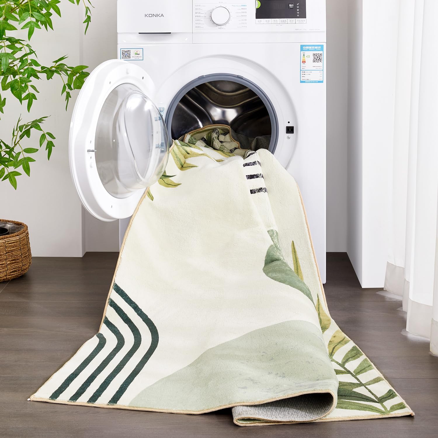 RoomTalks Boho Green Cute 3x5 Small Area Rugs Washable, Modern Abstract Geometric Shape with Tropical Leaves Non Slip Throw Rugs for Bedroom Kitchen Entryway Indoor Doormat Stain Resistant