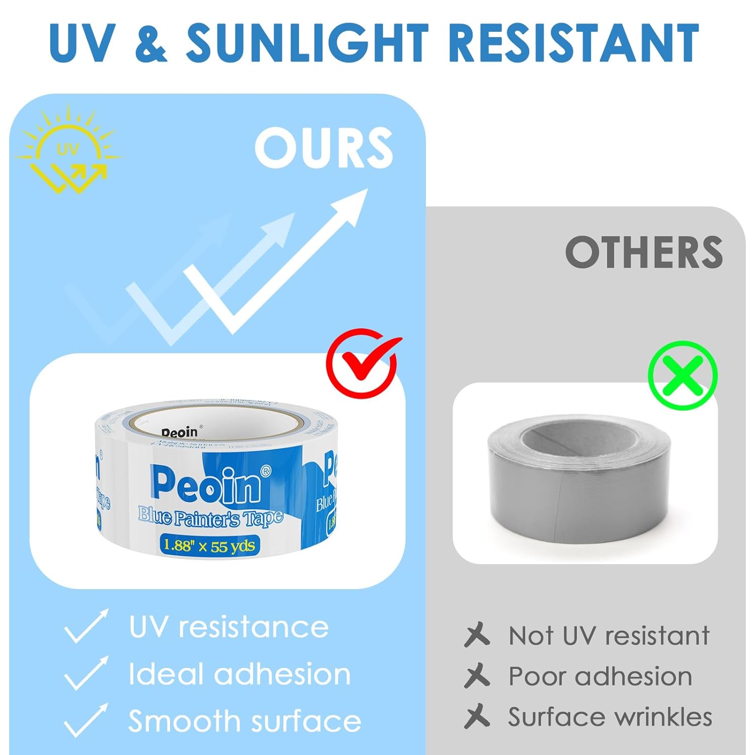 - UV Resistant: The blue painters tape 1.88 inch wide is made of high-quality crepe paper, preventing paint from seeping through and featuring UV resistance, moisture protection, and other characteristics, ensuring safety and efficiency. Perfect for all kinds of indoor and outdoor work. No need to worry about the tape getting wet