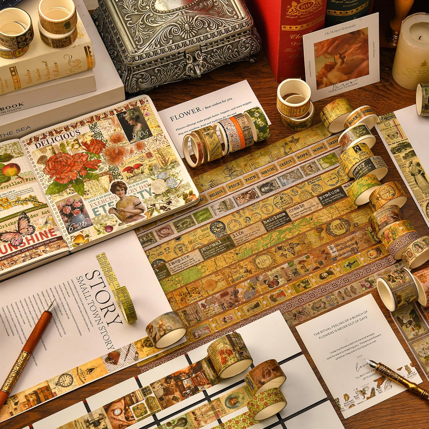 - 👍【CLASSIC ART DESIGN】This washi tape has a strong retro style, featuring a yellowed base color adorned with meticulously designed vintage patterns such as stamps, newspapers, specimens of flora and fauna, building Notes and manuscripts. It takes you back several decades, allowing you to experience the bygone era