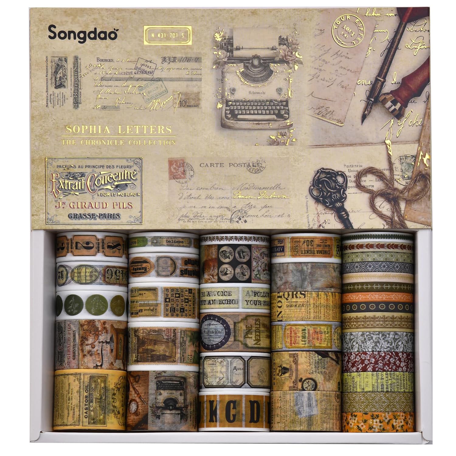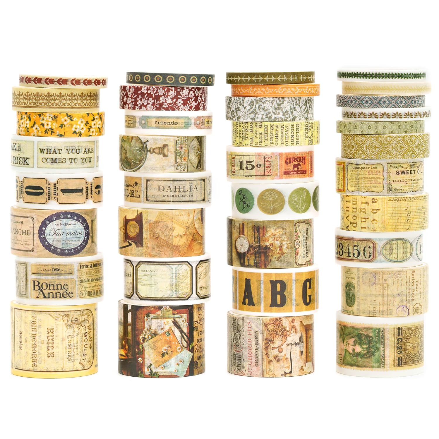 36 Rolls Vintage Washi Tape Pack Retro Arts Adhesive Tapes Wide Chronicle Decorative Masking Tape Sets for Craft, Kids, Scrapbook, DIY, Gift Wrapping (Sophia's Letters)