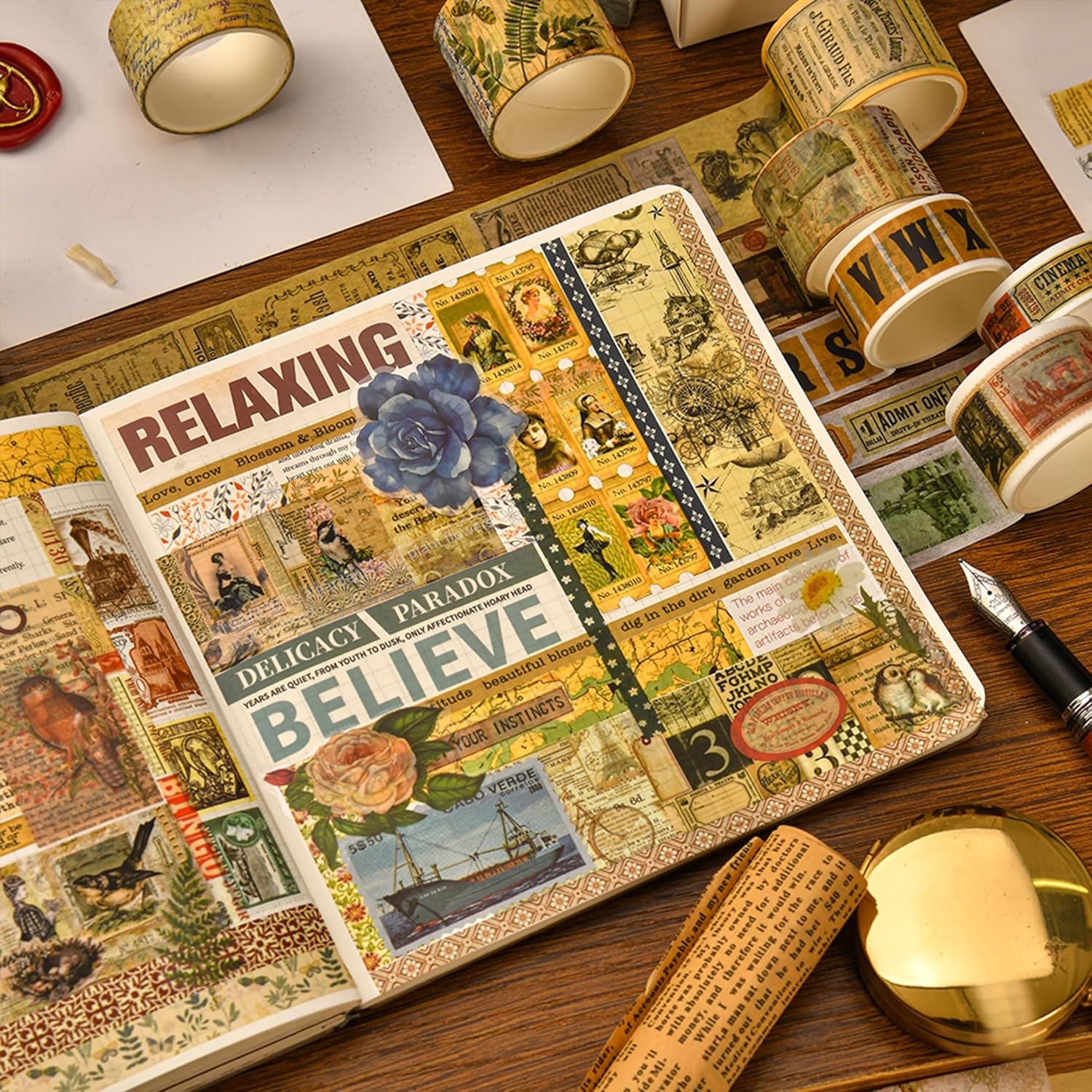 - 👍【CLASSIC ART DESIGN】This washi tape has a strong retro style, featuring a yellowed base color adorned with meticulously designed vintage patterns such as stamps, newspapers, specimens of flora and fauna, building Notes and manuscripts. It takes you back several decades, allowing you to experience the bygone era