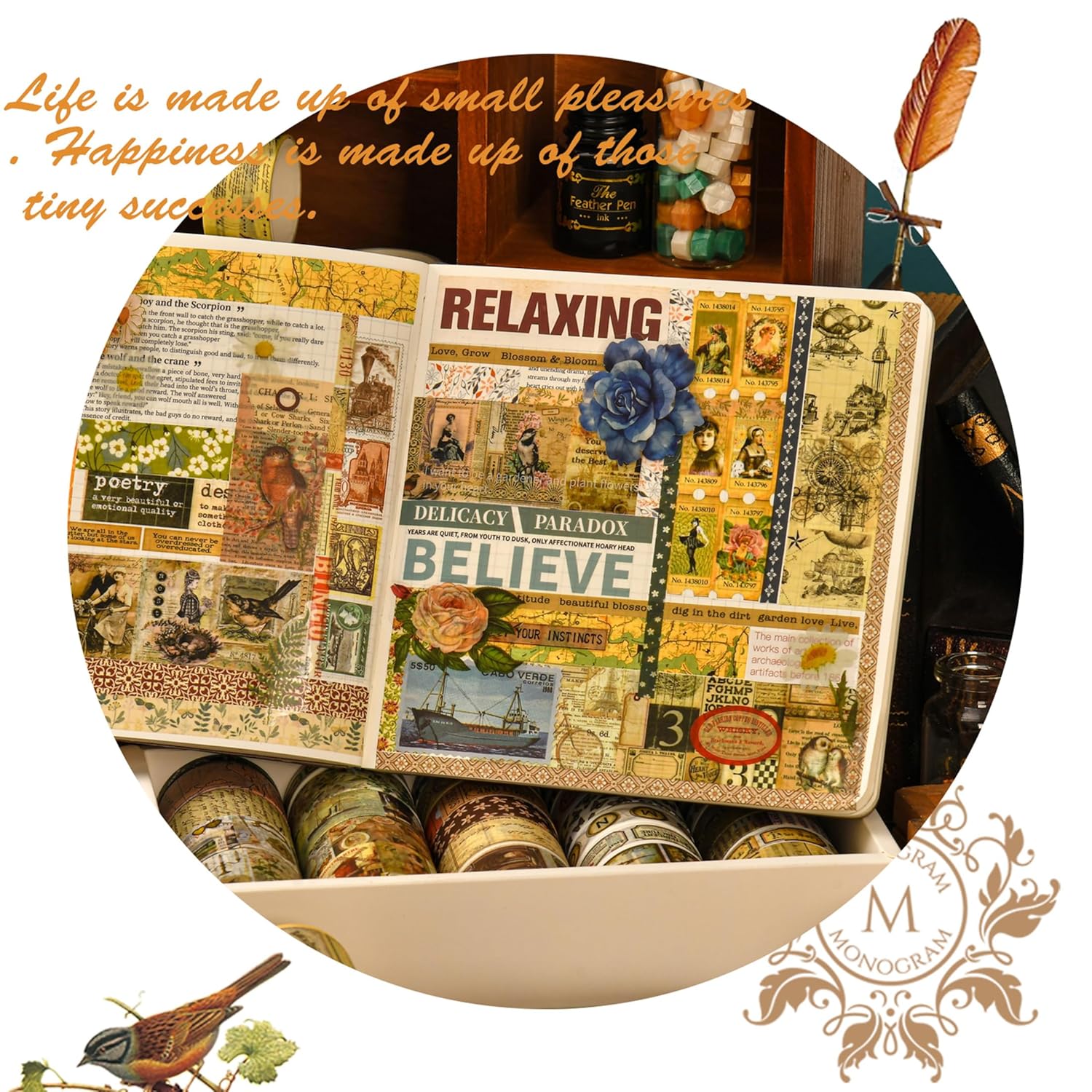 - Classic art design: This washi tape features a vintage style with yellowed base color and patterns such as stamps, newspapers, flora and fauna specimens, building notes, and manuscripts
