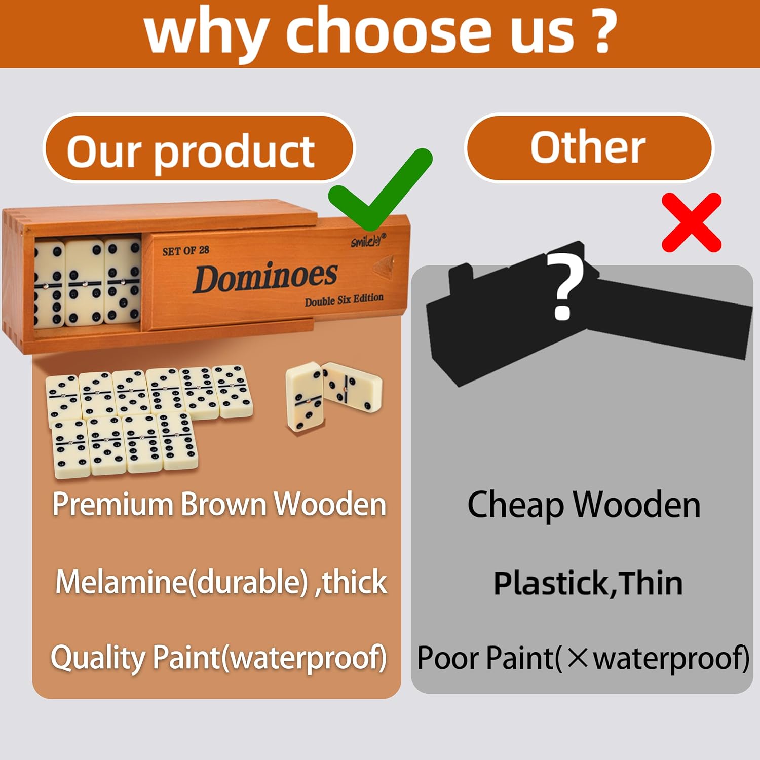 Smilejoy Dominos Set for Adults -Jumbo Size Dominoes Double Six Edition- Classic Board Games- Thick Size Double 6 Domino Set with Deluxe Brown Wood Box, 28 Tiles (2-4 Players)