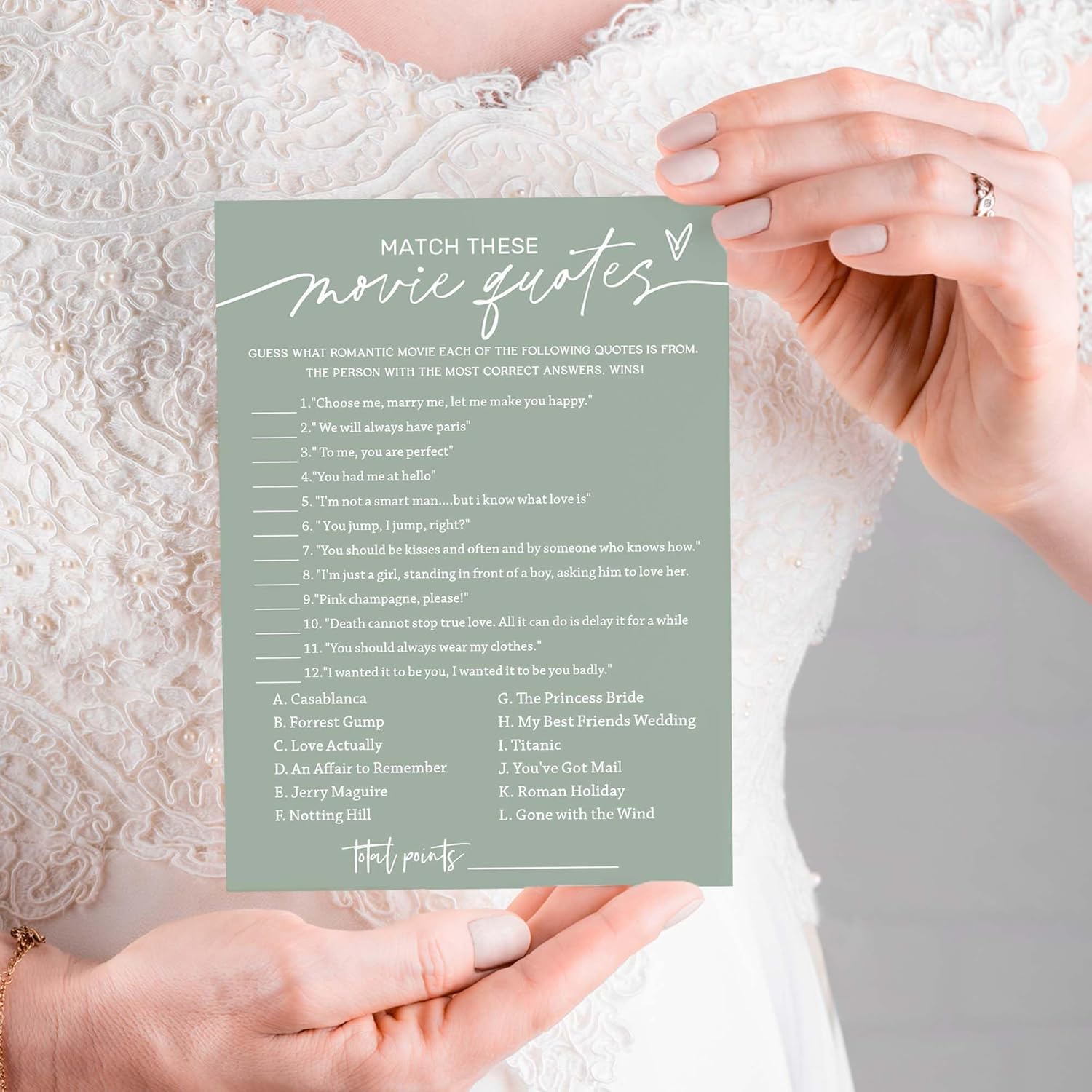 Bridal Shower Games Cards, Match These Movie Quotes, 25 Game Cards with 1 Answer Card, Engagement Party Wedding Games for Guests, Minimalist Green Wedding Party Supplies - C09