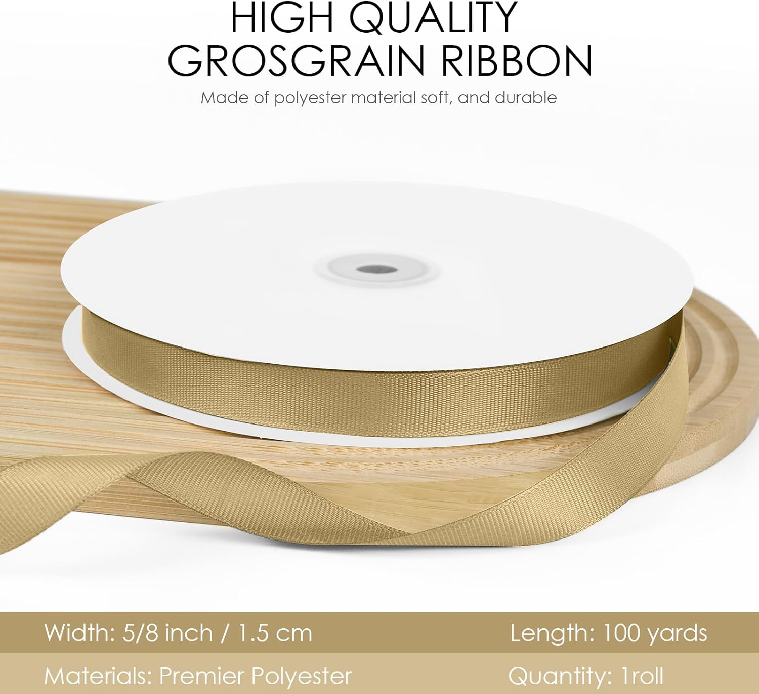 100 Yards 5/8 inch Grosgrain Ribbon, Solid Color Fabric Ribbon Perfect for Gift Wrapping, Wedding, Handmade Bows, Floral Bouquets and Party Decoration(Champagne Gold)