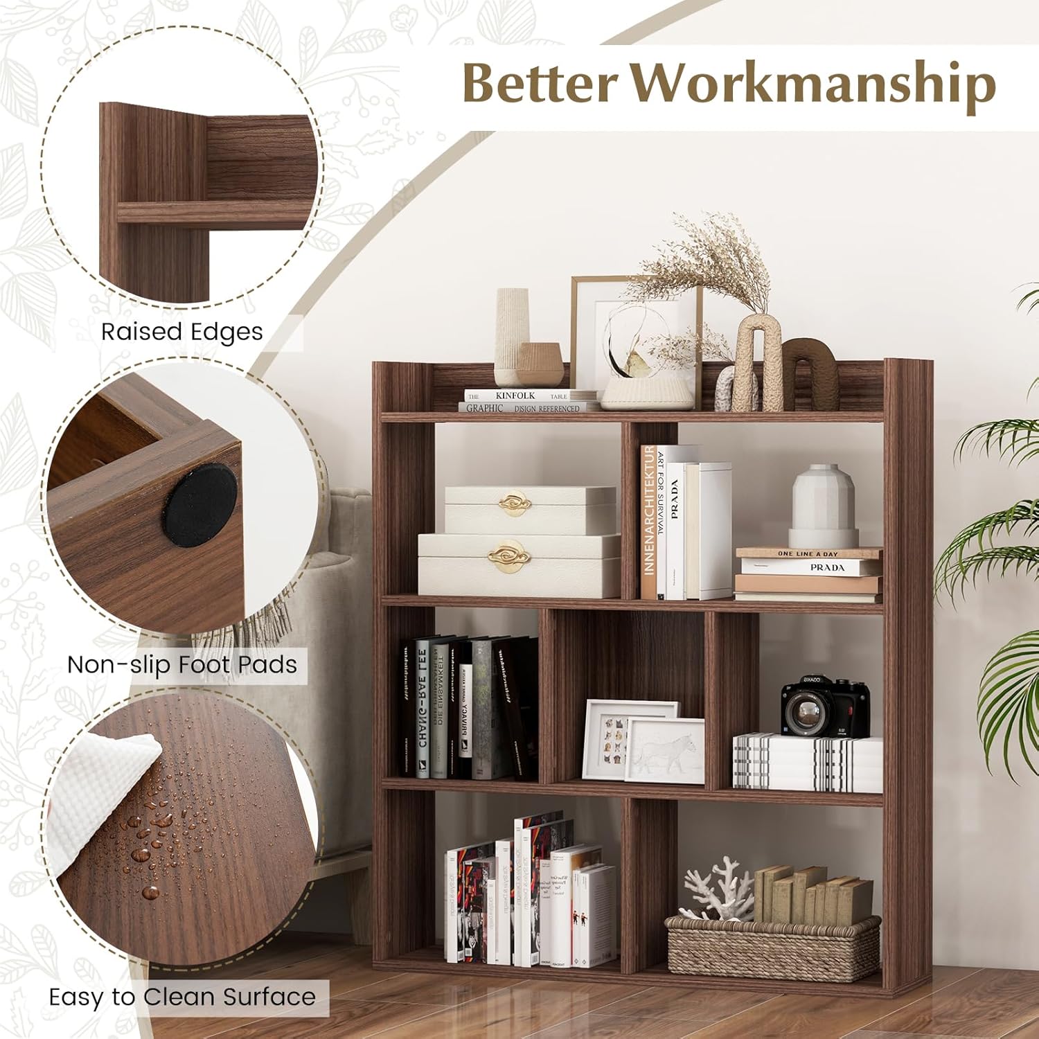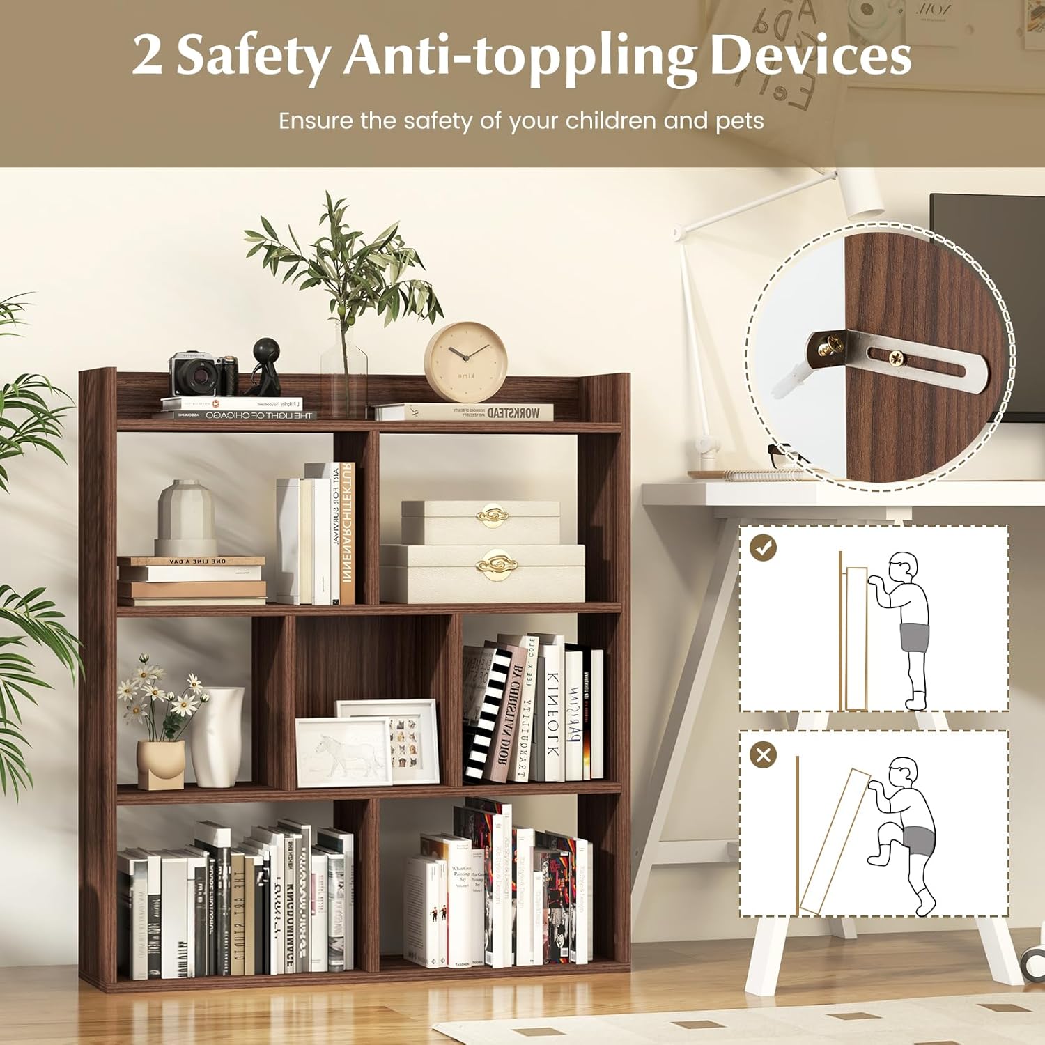 - [Safety First]: Our bookshelf comes with 2 anti-toppling devices for securing it to the wall, as well as anti-slip foot pads to prevent slipping and protect your floors. Raised edges also stop items from falling.