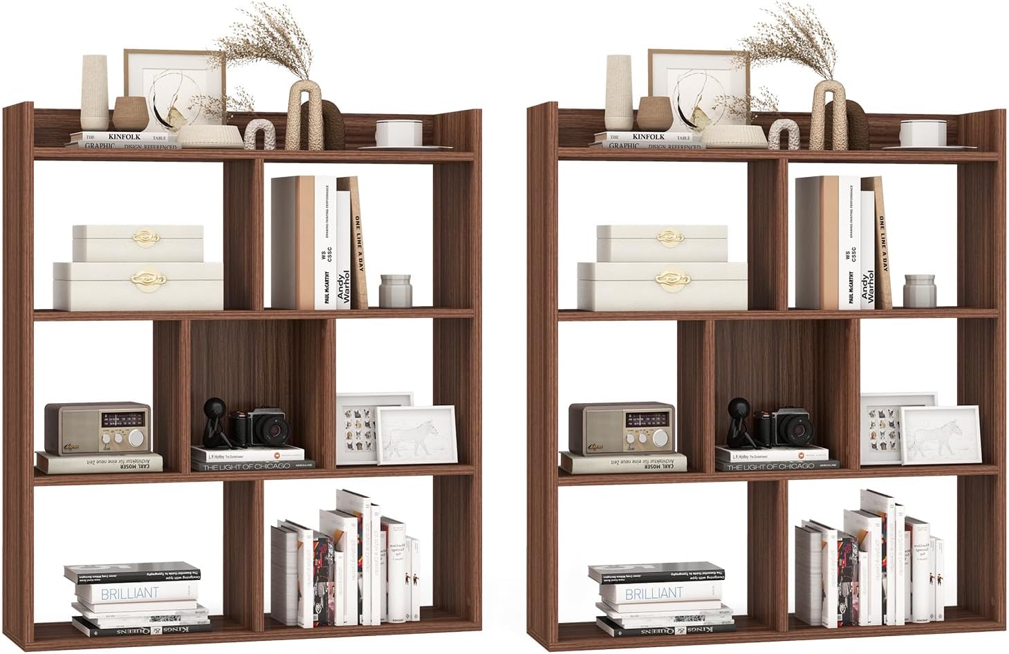 Giantex 7 Cube Bookshelf of 2, Free-Standing Wooden Bookcase, 4 Tier Home Display Shelf, Horizontal Storage Unit w/Anti-Toppling Devices, Open-Back Display Rack for Study, Living Room, Walnut