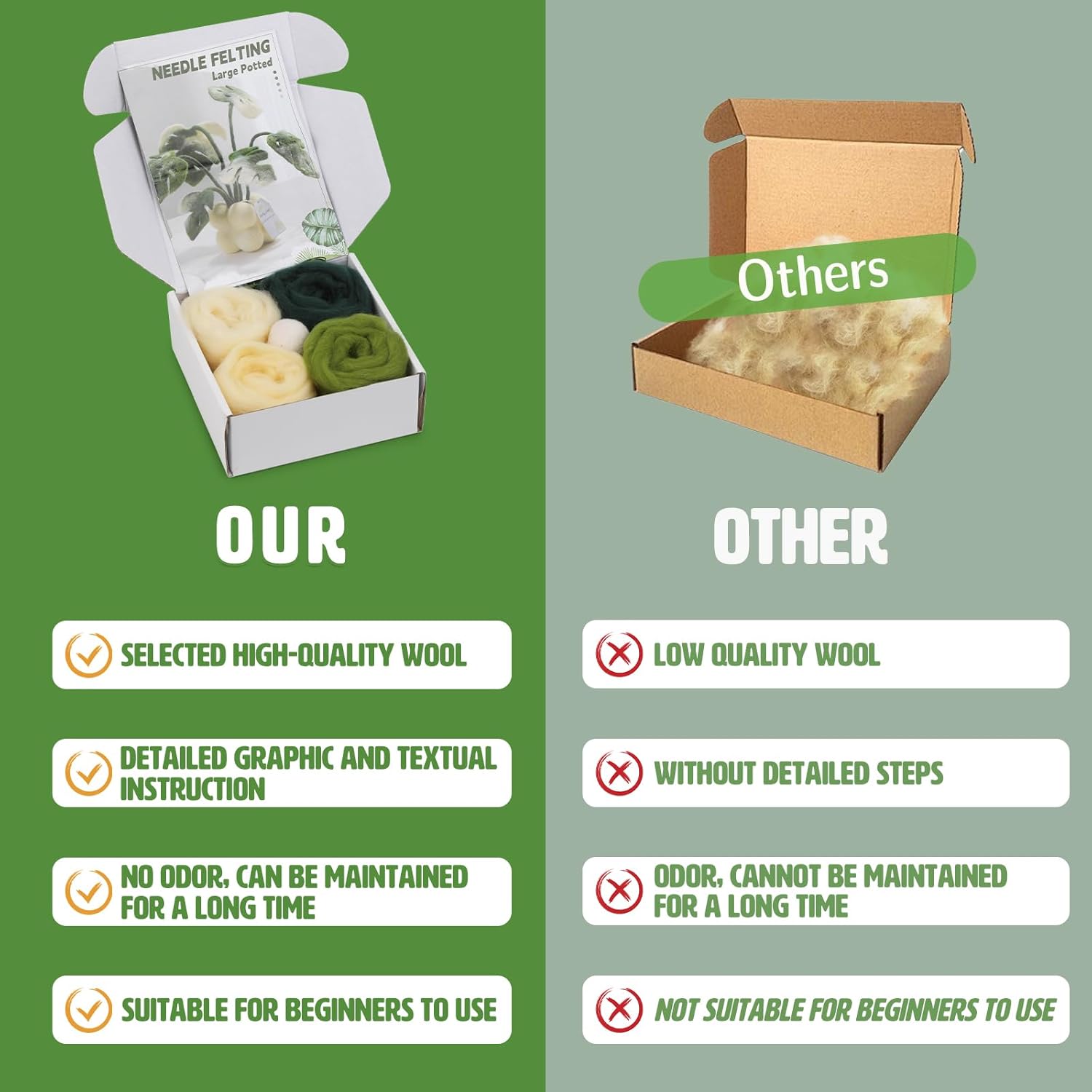 - Easy to Use: The wool felting kit contains 8 pcs 3.5 diameter felt wool balls, which reduces the time you spend felting pots and helps you improve your work efficiency. We provide very detailed needle felting instructions and video tutorials, and beginners can easily make plant needle felting according to the tutorials. The wooden felting tool is made of sturdy wood material, which feels comfortable and is not easy to break
