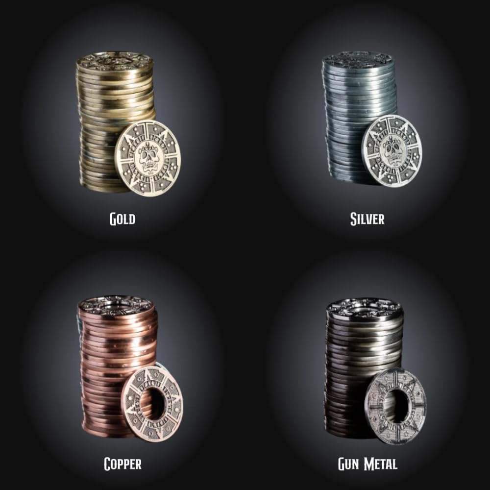 - **Versatile Coin Denominations:** The metal coins come in four denominations without labeled values to maintain the feel of real treasure. Suggested denominations are Gold ($25), Silver ($10), Gunmetal ($5), and Bronze ($1), allowing for flexible and imaginative gameplay.