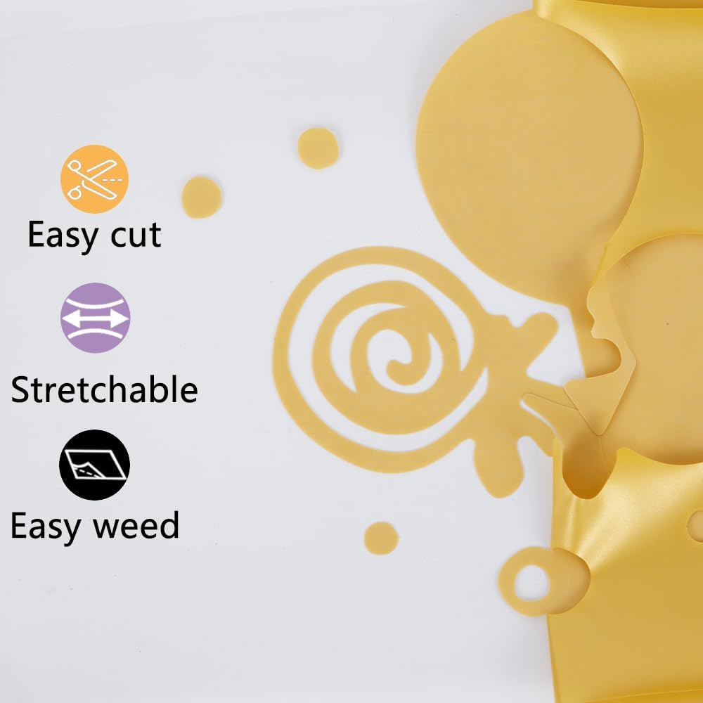 - PREMIUM QUALITY: Our golden heat transfer vinyl rolls are crafted from high quality and eco-friendly vinyl material, soft, thinner but high elastic, ensures strong adhesion to fabric, fade resistance, and durability. Easy to weed and peel. Certified by SGS, safe for children's clothing. Machine washable