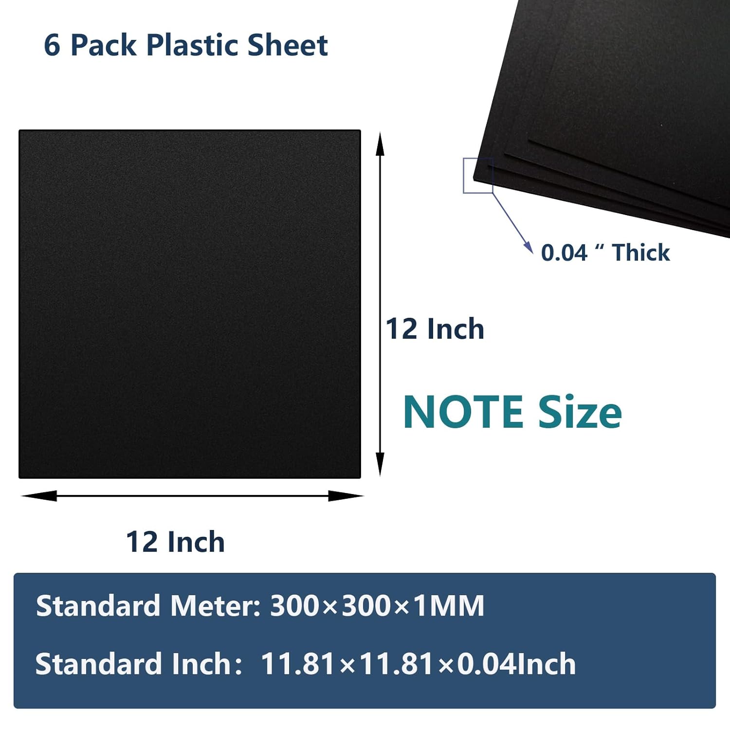 - Plastic Sheet: This pack includes 6 high-quality black plastic sheets, measuring 12ร12 in size,their thickness of 0.04 in. These plastic sheets are an important part of a variety of applications, offering a durable and versatile solution for all your project needs.