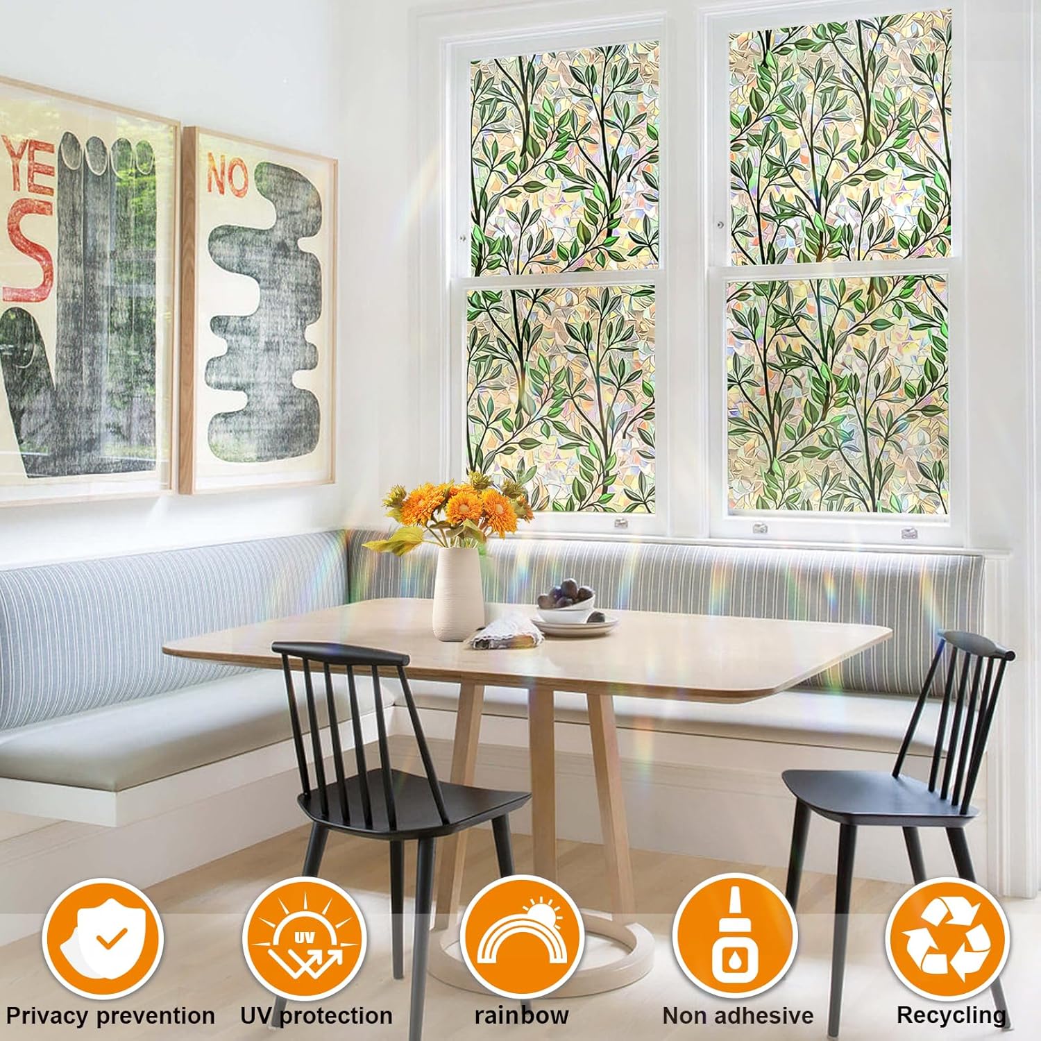- DECORATIVE DESIGN: These window films feature a beautiful green leaf pattern that adds a natural freshness to any room and creates a rainbow visual effect when the sun shines.
