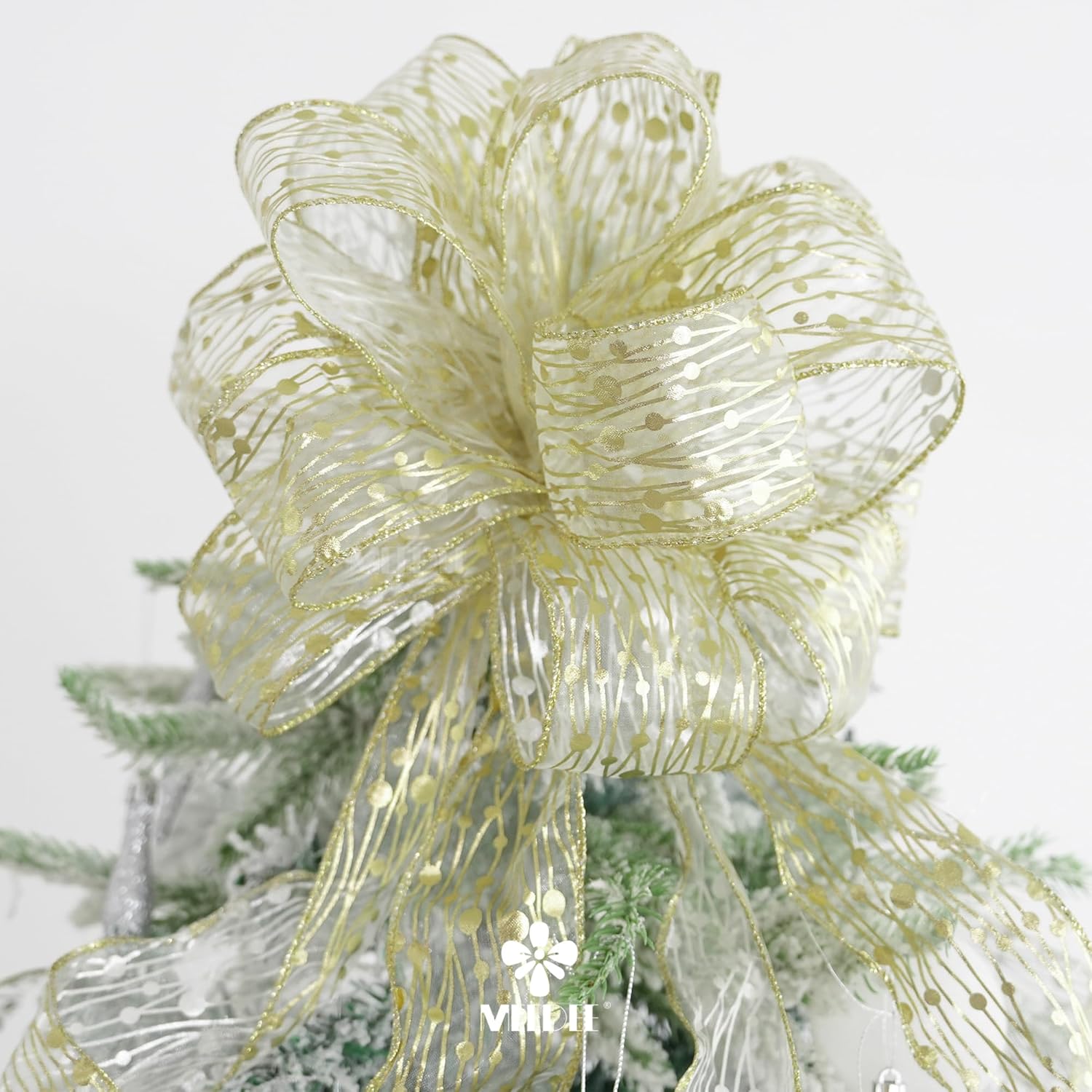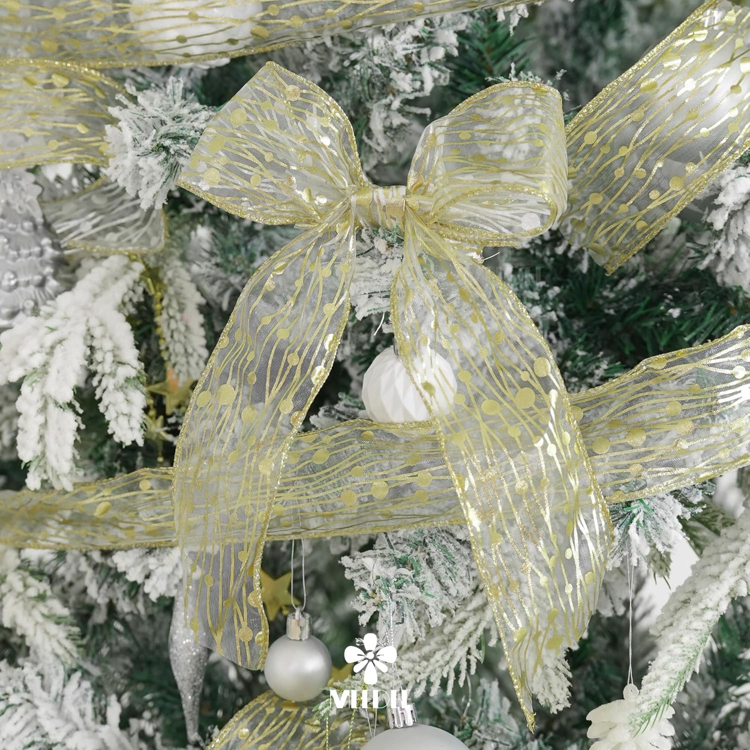 MEEDEE Gold Wired Ribbon - 2.5 Inch Sheer Organza With Horizontal Stripes and Polka Dots - 25 Yards for Gift Wrapping, Garland