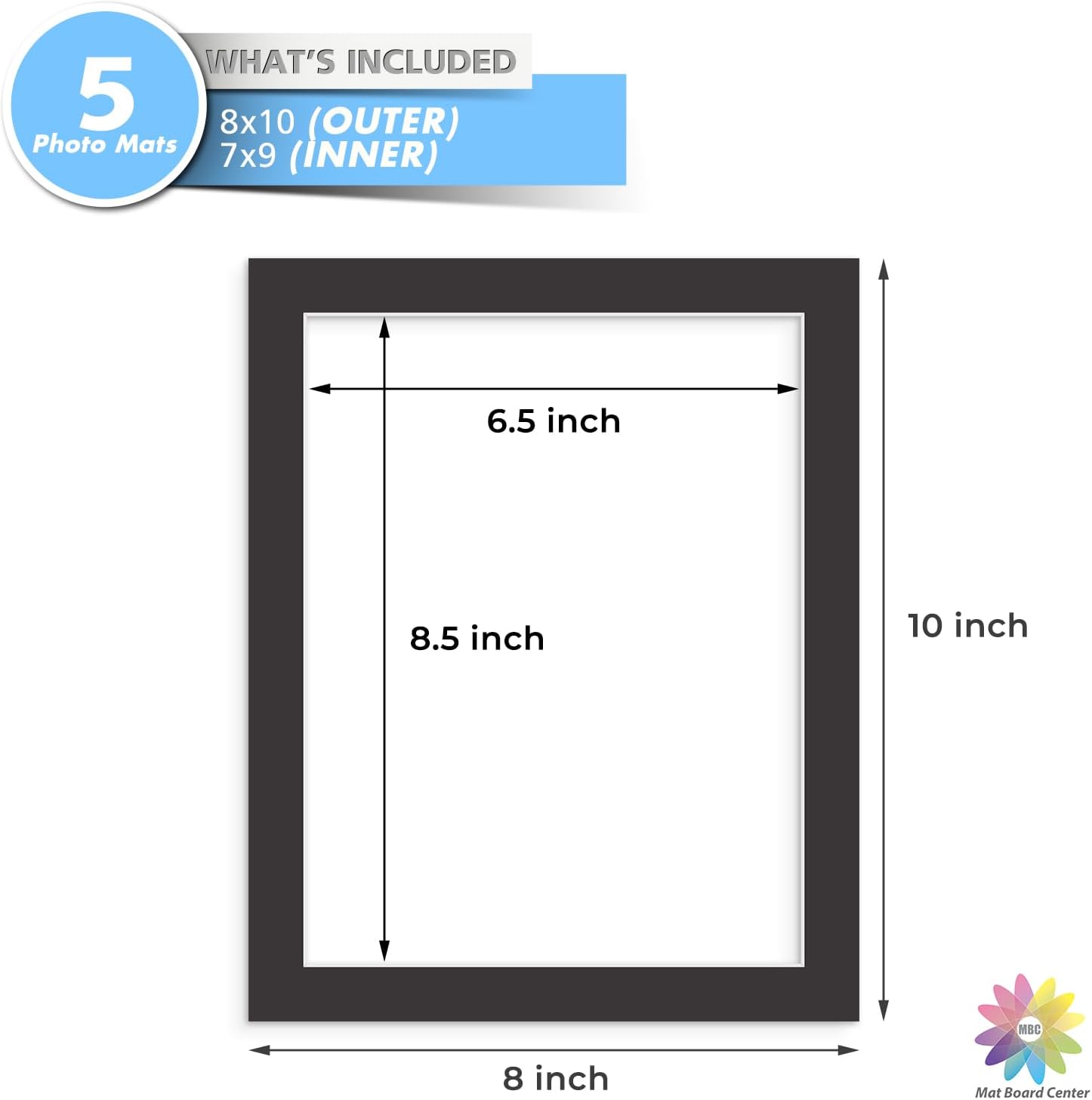 MBC MAT BOARD CENTER, 5 Pack 8x10 for 7x9 Black Picture Mats Frame Mattes, Bevel Cut, Acid Free, 4-ply Thickness