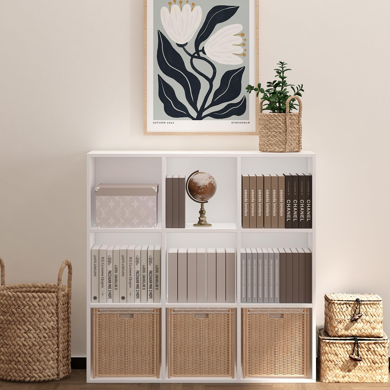 - Versatile Storage Solution: Perfect for use in the study, bedroom, living room, kitchen, or hallway, this 9 cube organizer offers practical storage space for books, decor, and other essentials. Enhance your home storage with this sleek and functional furniture piece.Please Note: All accessories in the cube organizer (storage bins/boxes, hanging paintings, cups, books, etc.) are not included. Organizer made of FSC-Certified Wood