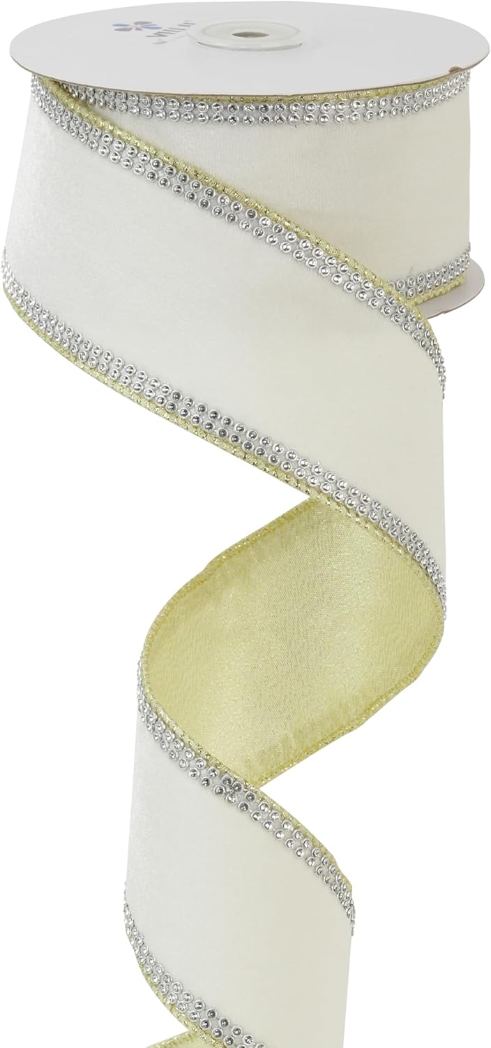 - Our 2-1/2 inch wide white velvet wired ribbon, featuring stunning rhinestone trim on both sides. Crafted with meticulous attention to detail, this ribbon is a statement of sophistication, perfect for enhancing Christmas decor or elevating winter weddings. With 5 yards in length, it's ideal for various creative projects, from festive decorations to elegant wedding accents. The rich texture of the velvet provides a plush feel, while the sparkling rhinestones add a touch of glamour.