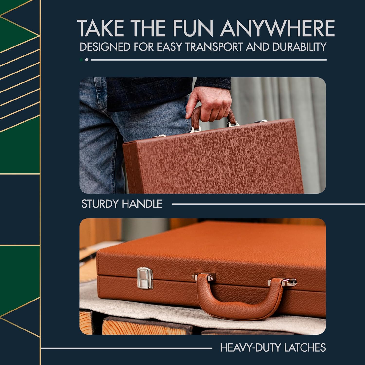 - Play or Display - Make a Statement: Designed for both action and style, this modern 19 x 25-inch board offers a spacious playing field for fast, high-energy games. Its briefcase-style design folds in half for easy storage and makes for a great travel backgammon set portability. Whether closed to showcase the luxurious PU pebble-grain leather finish or open to display the premium accessories, this board is a stunning addition to any home.
