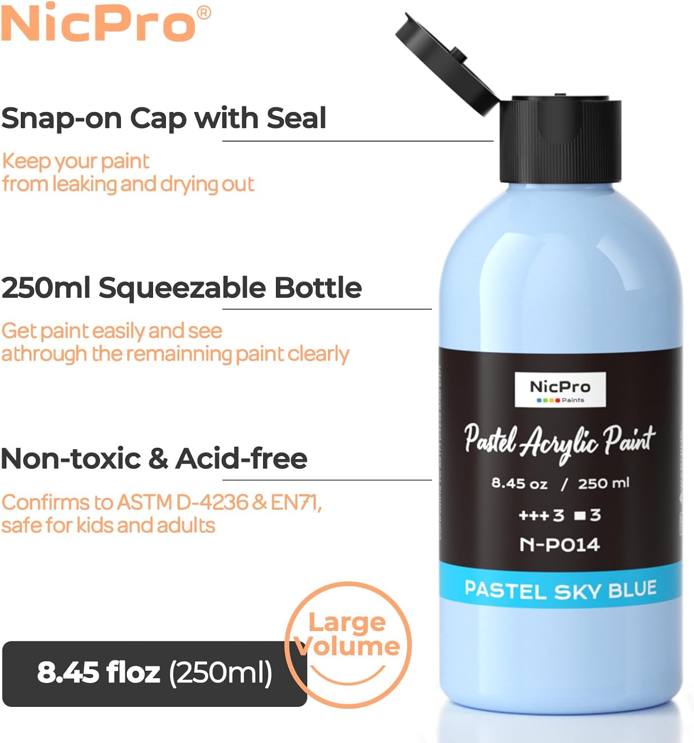 - 20 Soft Pastel Colors - The Nicpro Large Pastel Acrylic Paint Set includes 20 bright pastel colors(250ml/8.45 fl oz each bottle). Perfect for beginners, professional artists, and crafters to create lovely and dreamy artworks or craft DIY projects.