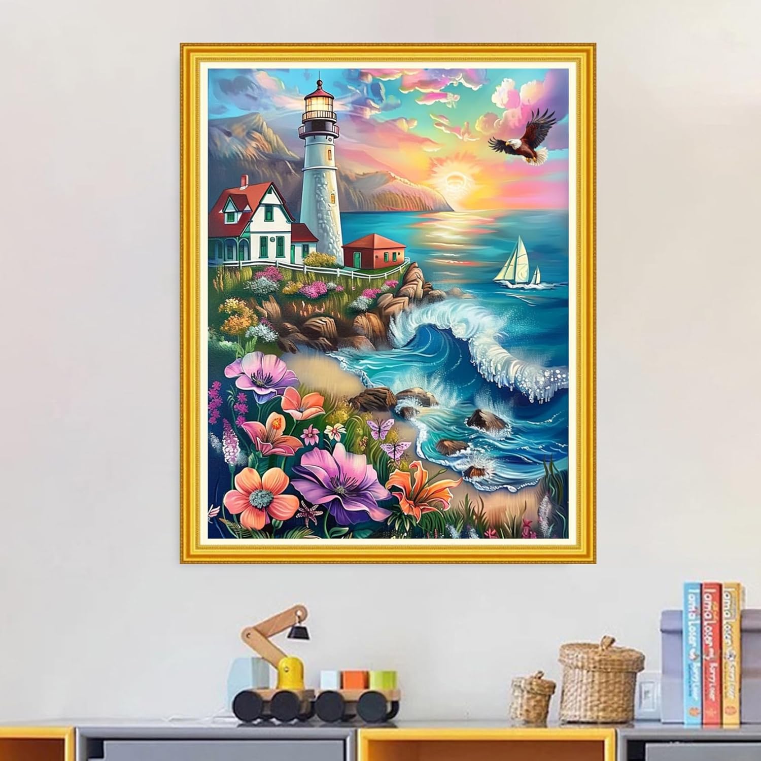 Magxvouy Cross Stitch Kits Stamped Full Range of Embroidery Kits,Cross Stitch Patterns Needlework Kits for Beginners 11CT Printed Kits&Lighthouse Seaside Flowers 16x20 inch