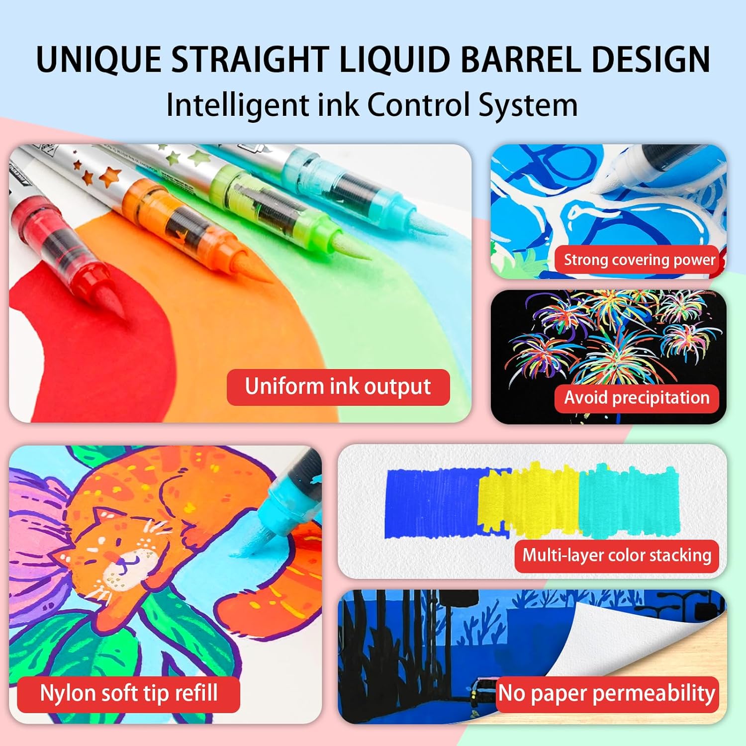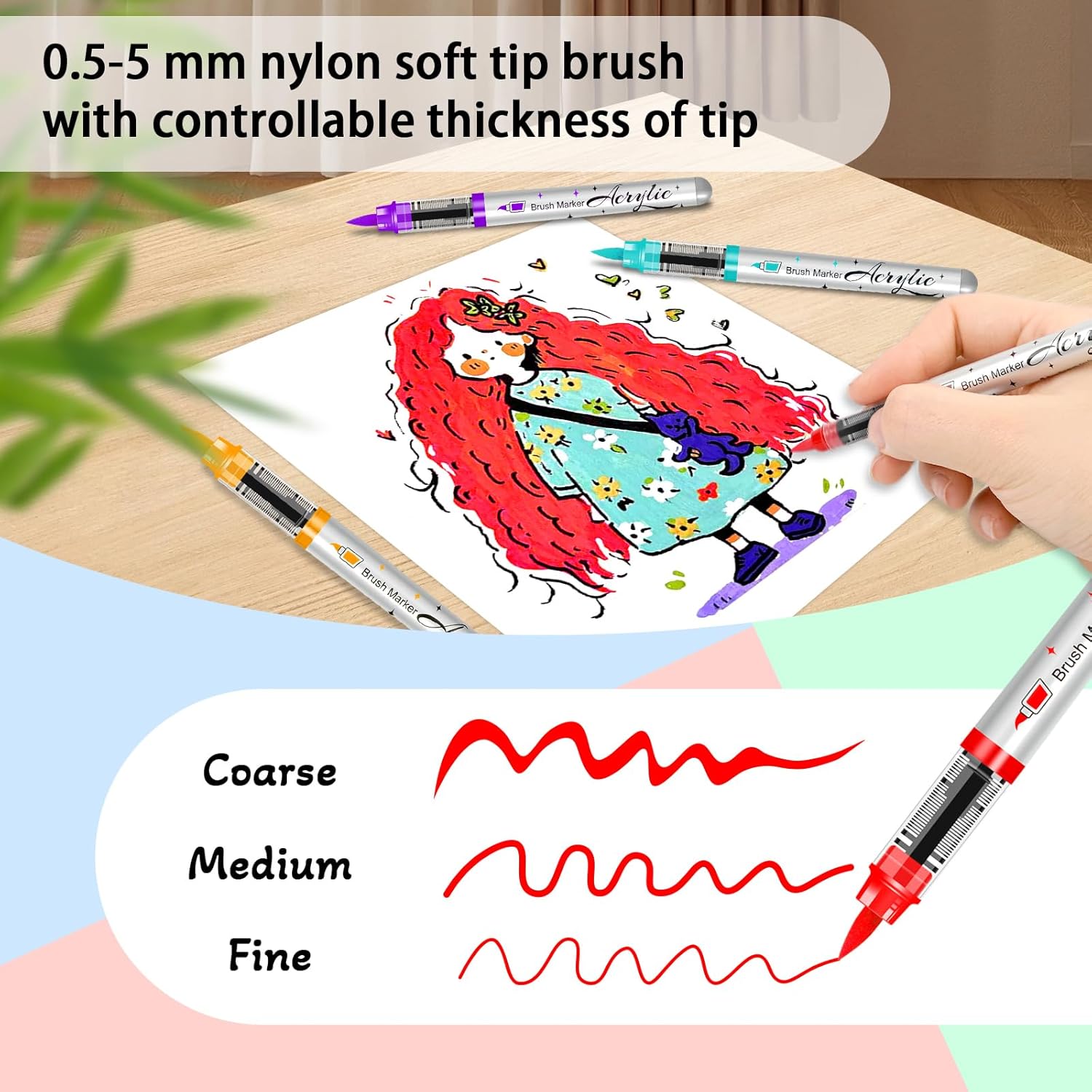 - 【Unique Straight Liquid Barrel Design:】 Acrylic paint markers with straight liquid ink filling, comes with intelligent ink control system, uniform and not easy to leak. 0.5-5 mm nylon soft tip brush nib, smooth and fluid painting, this acrylic marker pens is an art supplies to meet all your creative needs.