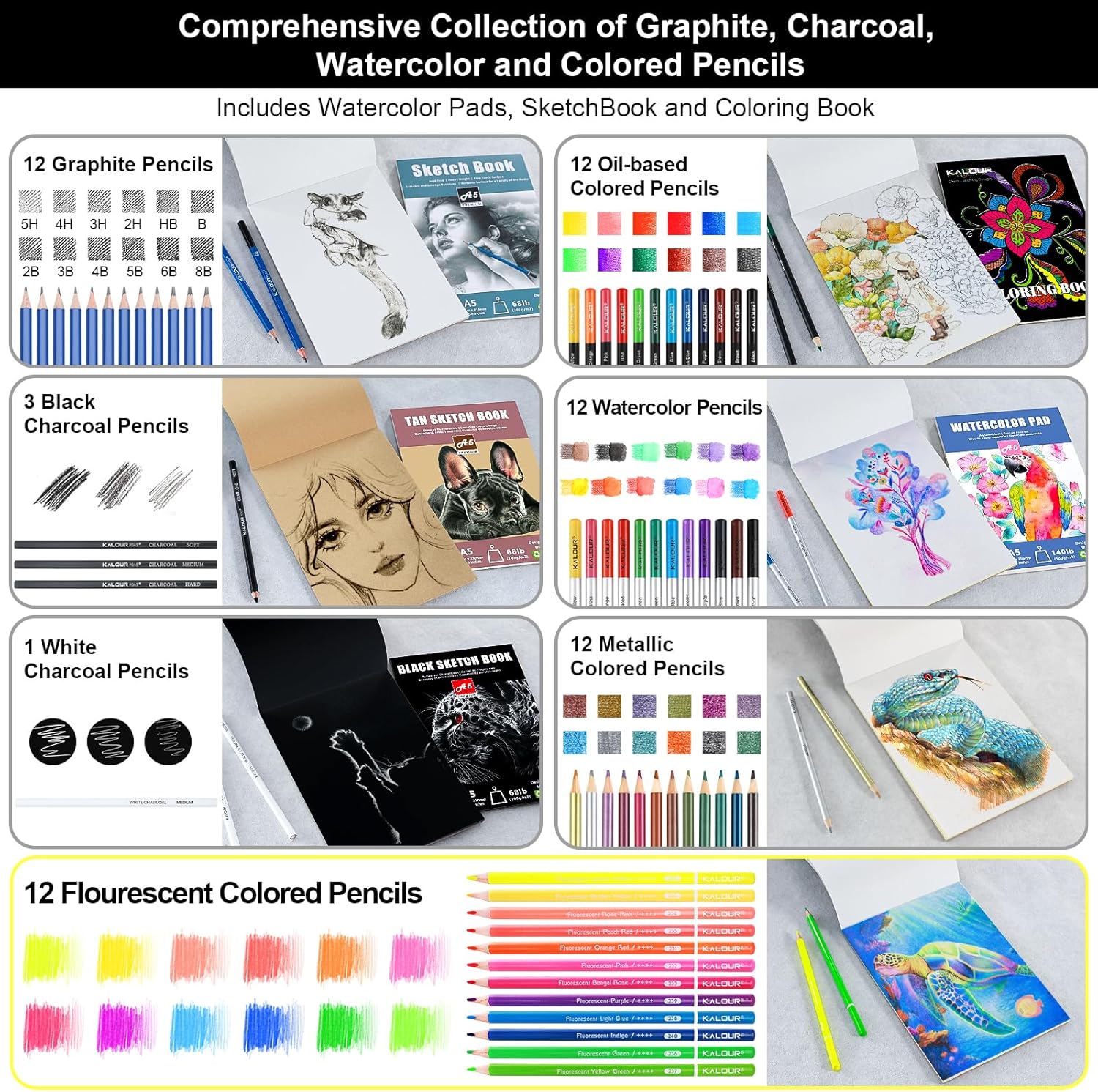 - Premium Art Drawing Supplies: This set comes with 12 Neon Colored Pencils, 12 Colored Pencils, 12 Metallic Pencils, 12 Watercolor Pencils, 12 Sketching Pencils, 3 Black Charcoal Pencils, 1 White Charcoal Pencils. Each pencil is marked with its color name and number, making it perfect for drawing, sketching, coloring, shading, layering, and blending.