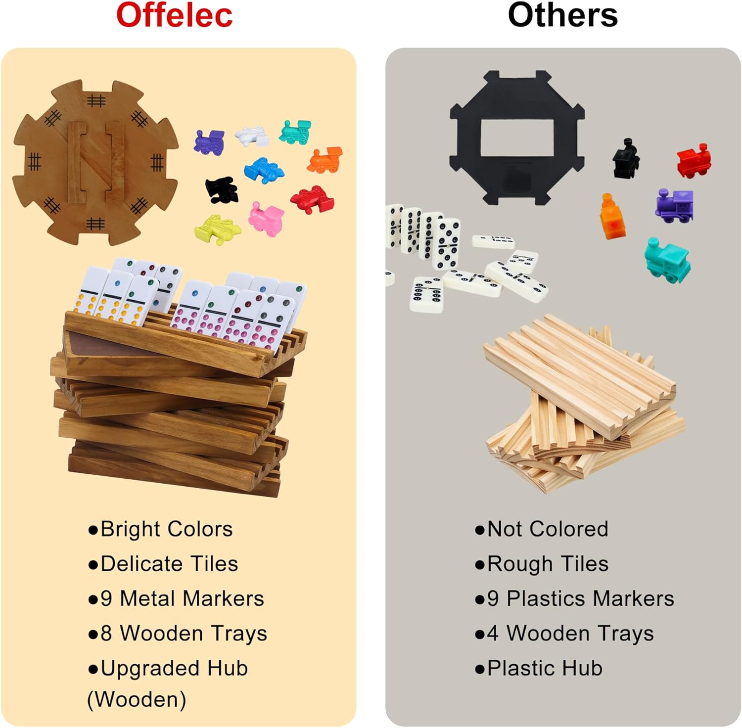 - 【Mexican Train Dominoes Set with Wooden Box】: Offelec double 12 mexican train dominoes set is a complete set that includes everything you need. Includes: 91 Dots Dominoes, 9 Durable Metal Trains, 8 Wooden Racks, 1 Wooden Hub, 1 Instructions and 2 Scoreboards.