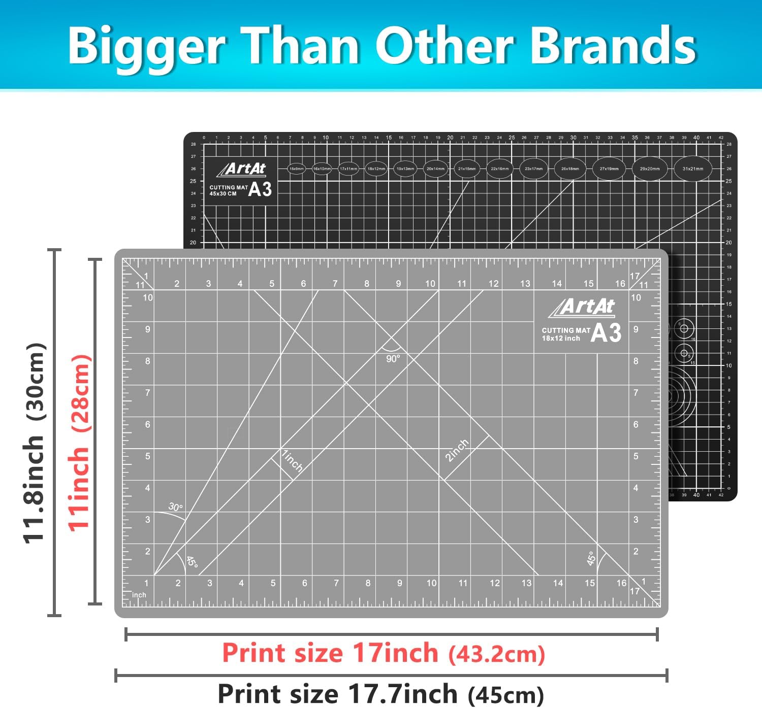 - 【A3 CUTTING MAT】Our cutting mat boasts a durable 5-ply self-healing design, complete with 1/2" grid and 1/8" marks for precise alignment, 30° 45° 60° 90° guides, and diagonal cutting lines.