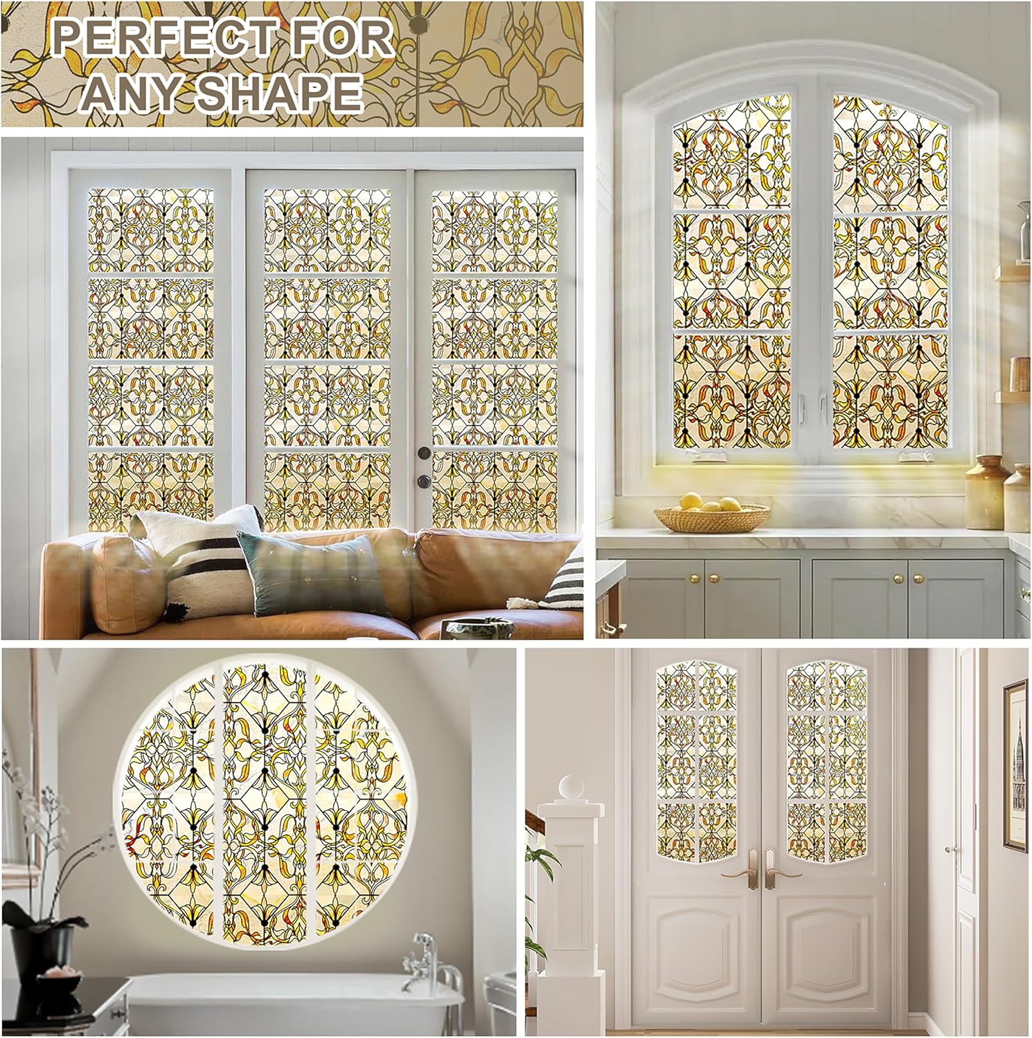 3D Stained Glass Window Privacy Film, Heat Control UV Blocking Static Cling Decorative Window Film for Bathroom,Front Door,Home Non Adhesive 16.9 x 78.7 inches Golden Filigree