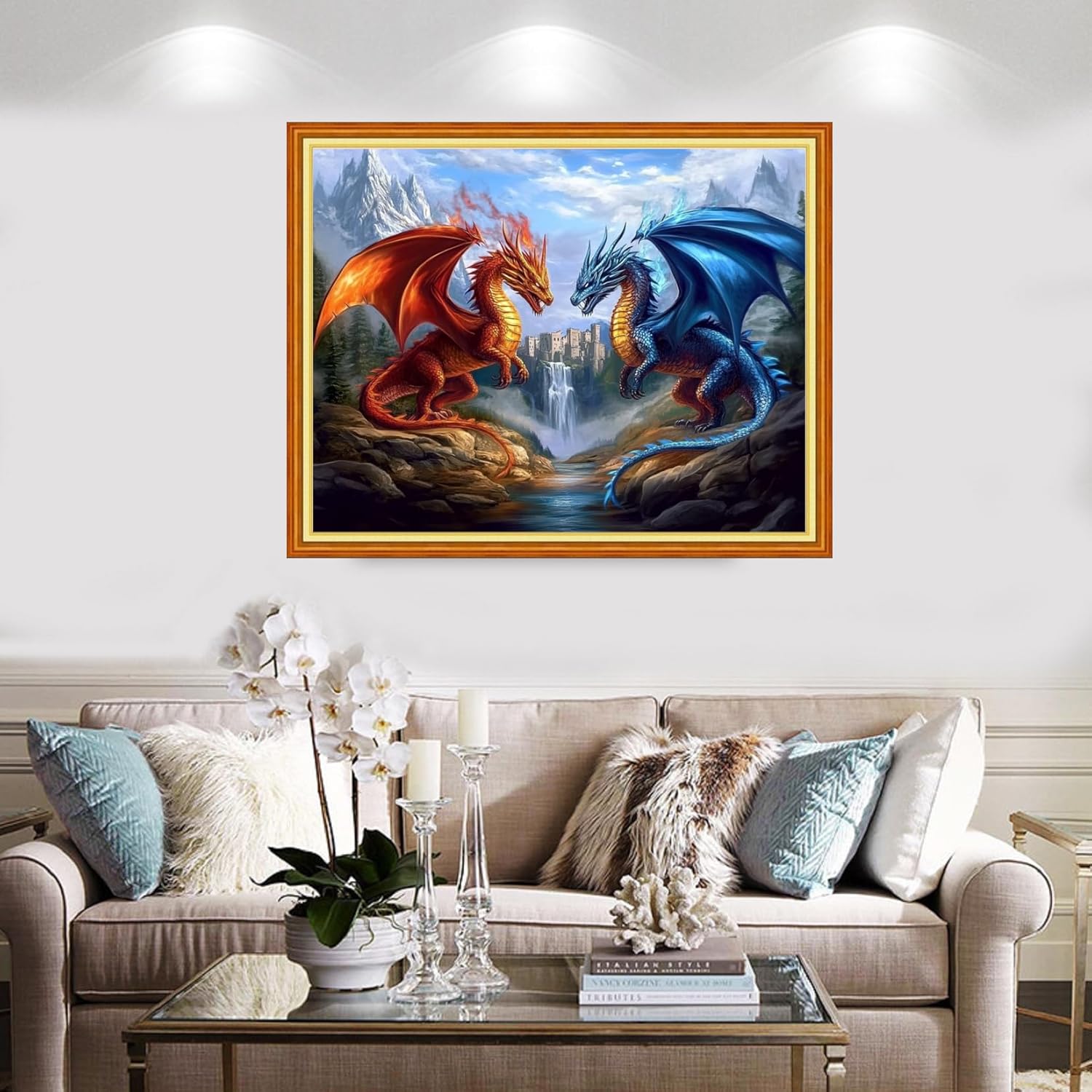 Redxing Stamped Cross Stitch Kits Full Range of Embroidery Starter Kits- Needlepoint Counted Cross Stitch Kits for Beginner Adults 11CT Printed Embroidery Kit-Water Fire Dragon Landscape 16x20 inch