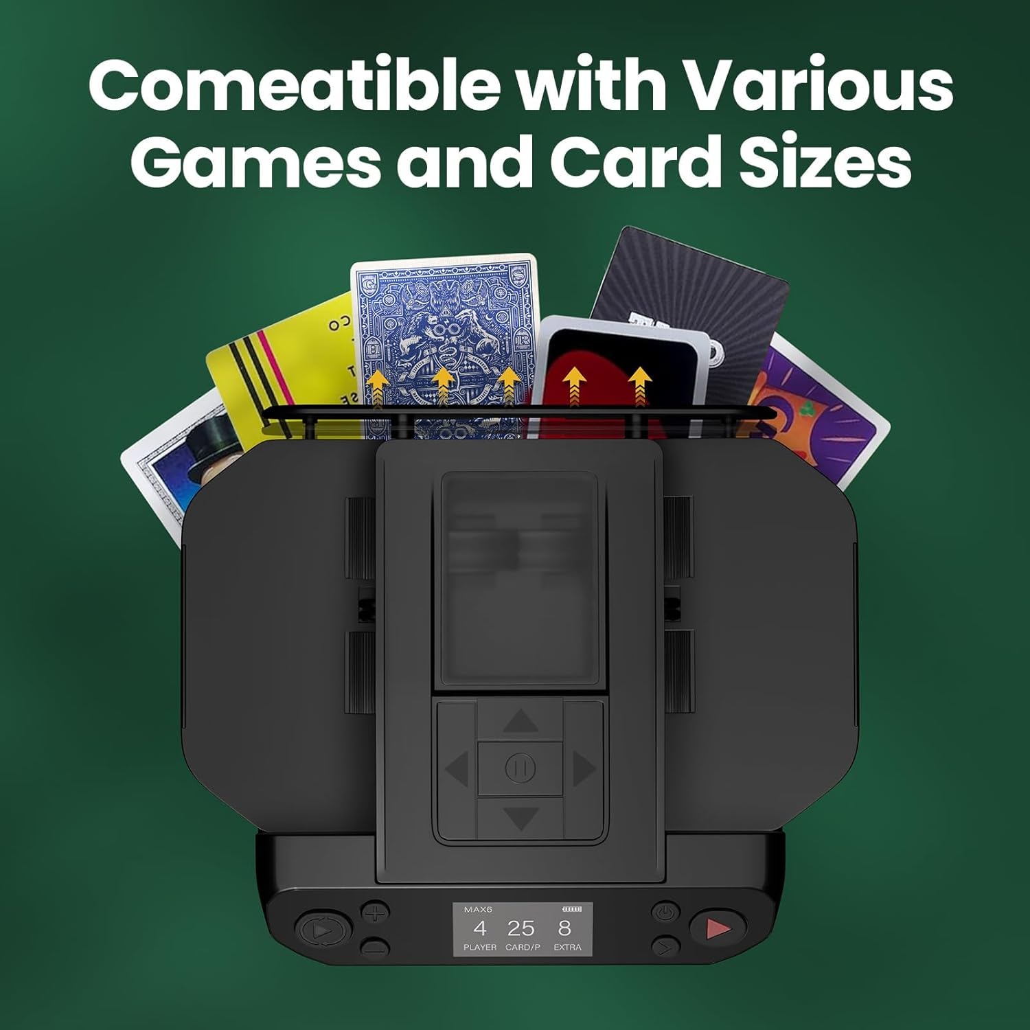 - [More Games & More Players] The MAX6 machine supports up to 12 players, with enhanced settings for dealing distance and compatibility with a range of remote controllers (1-12). Ideal for various card games, including Poker, UNO, and Five Crowns. The adjustable card tray and open tray design can accommodate different card sizes, giving you more flexibility and allowing more participants to join the fun.