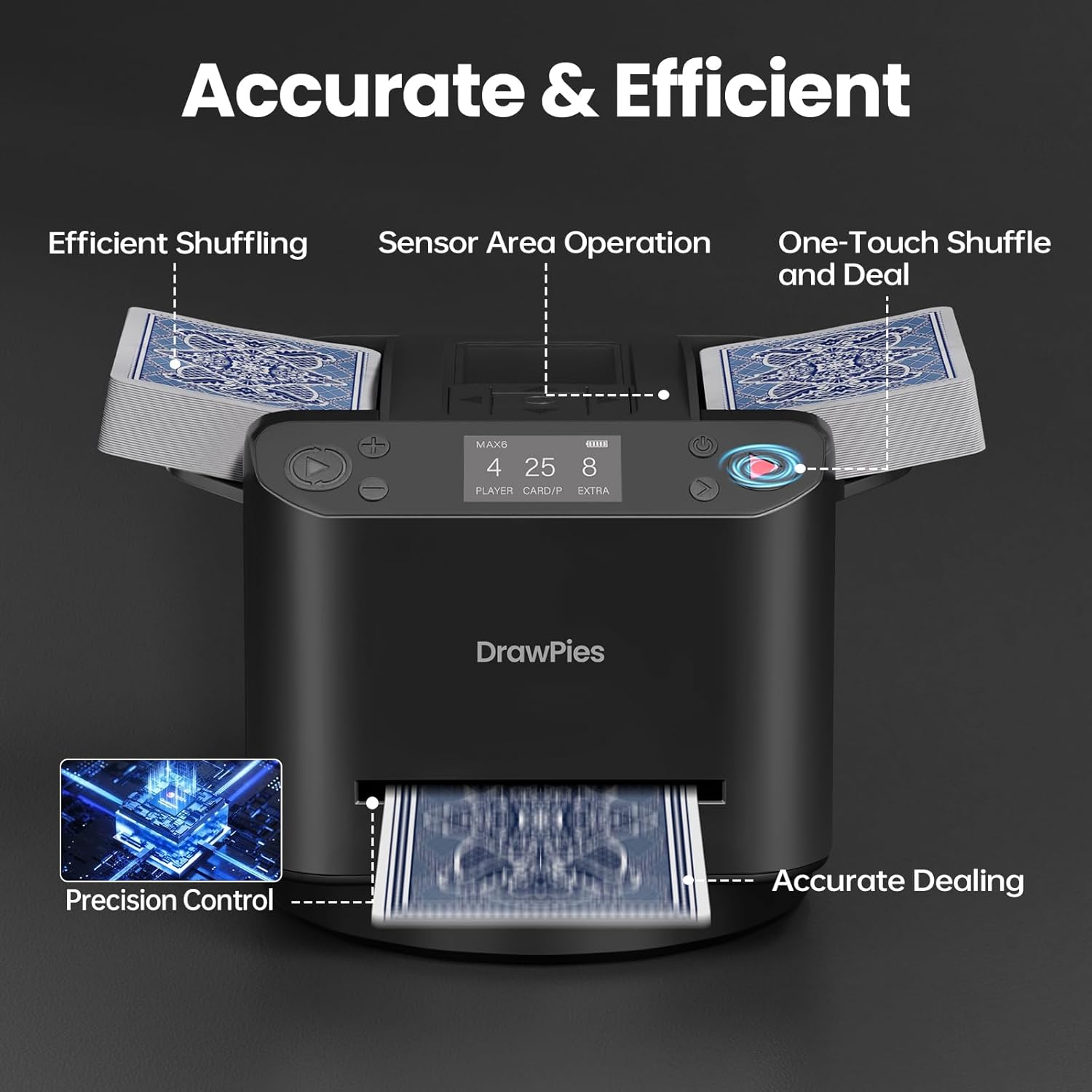- [Accurate & Efficient] The DrawPies MAX6 2-in-1 automatic card shuffler and dealer machine is the perfect solution for seamless shuffling and dealing. Equipped with advanced CNC precision technology, it ensures accurate card dealing. Simply press a button to shuffle and deal cards according to your preferred settings. Save time, energy, and enjoy fair gameplay with effortless automation.