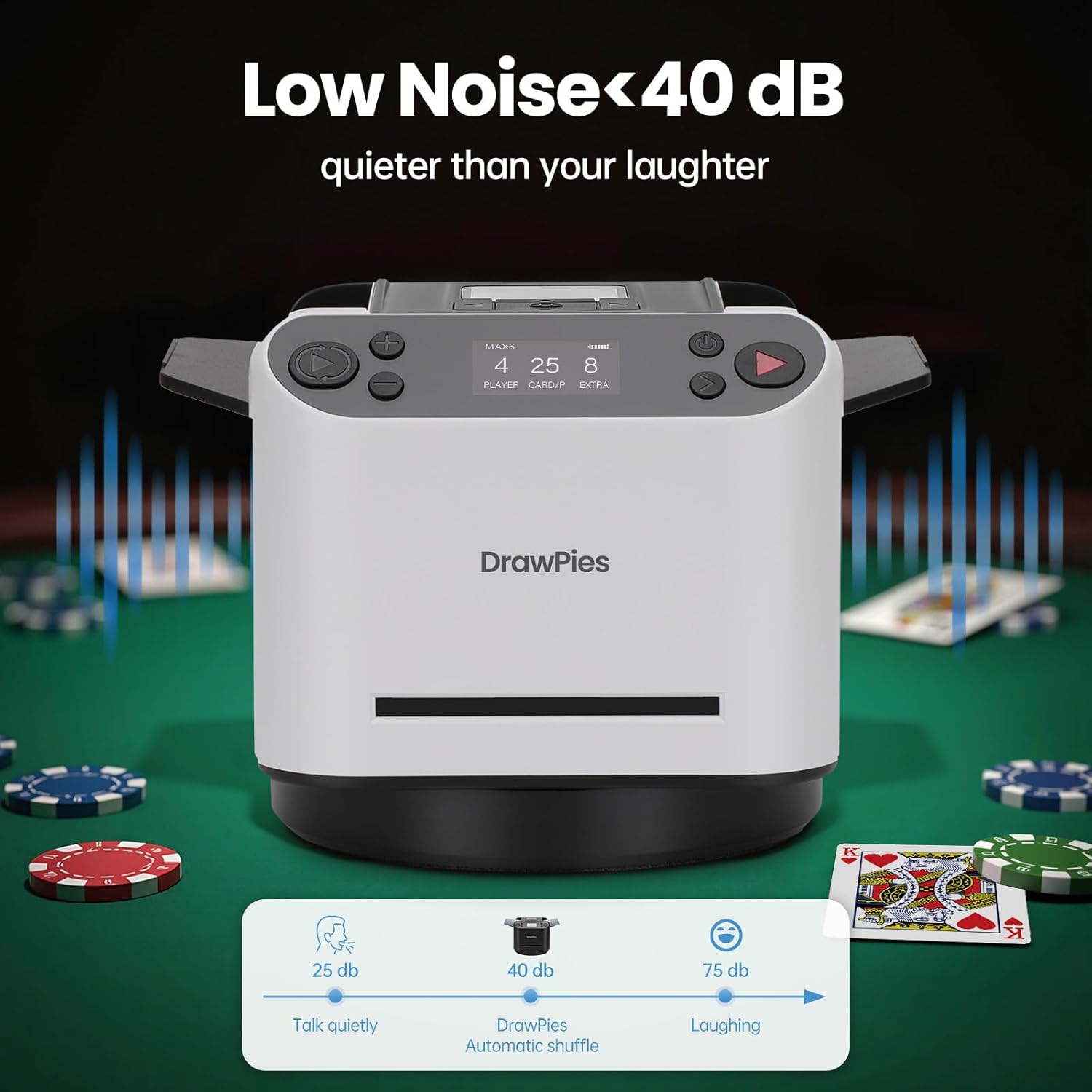 - [Accurate & Efficient] The DrawPies MAX6 2-in-1 automatic card shuffler and dealer machine is the perfect solution for seamless shuffling and dealing. Equipped with advanced CNC precision technology, it ensures accurate card dealing. Simply press a button to shuffle and deal cards according to your preferred settings. Save time, energy, and enjoy fair gameplay with effortless automation.