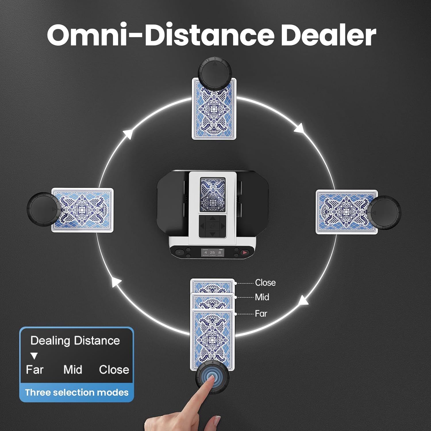 - [More Games & More Players] The MAX6 machine supports up to 12 players, with enhanced settings for dealing distance and compatibility with a range of remote controllers (1-12). Ideal for various card games, including Poker, UNO, and Five Crowns. The adjustable card tray and open tray design can accommodate different card sizes, giving you more flexibility and allowing more participants to join the fun.