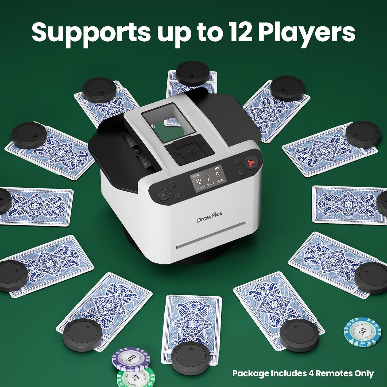 - [Customizable Dealing Options] With DrawPies Max6, you can adjust player numbers, card counts, dealing direction, and distance to match the game you're playing. Whether it's Poker, UNO, or Five Crowns, the machine offers flexibility to adapt to various rules and playstyles. It also includes quick setup options for popular games like Texas Hold'em and Bridge.