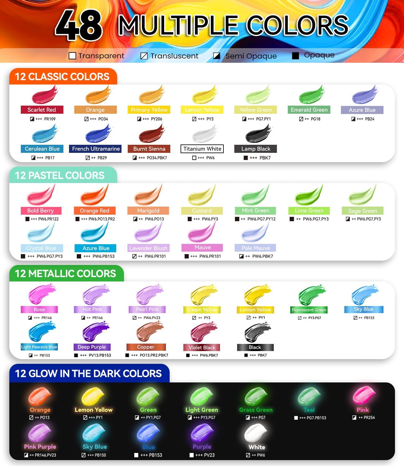 - Premium Quality Pigments: This mixed acrylic paint set features 12 classic colors, 12 macaron pastel colors, 12 glow in the dark colors, 12 metallic colors, each with a 60ml volume. Made with high-grade pigments, these art paints provide smooth and consistent coverage, ensuring vivid, true-to-tone hues. The colors are blendable and mixable, allowing for a wide range of creative possibilities. Designed to resist fading, these paints maintain their brightness over time, making them perfect for eye-catching projects