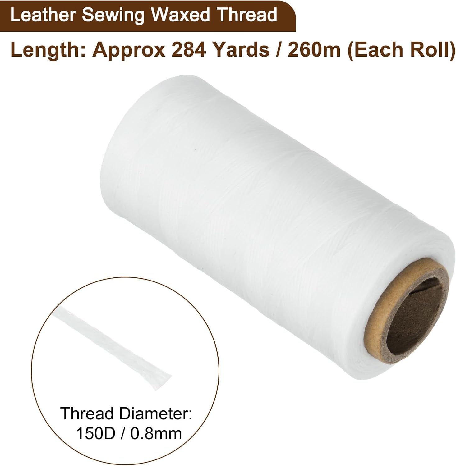 - Waxed Thread: Thread Diameter: 150D / 0.8mm; Total Length: Approx 284 Yards / 260m (Each Roll); Material: Polyester; Color: White; Package Contents: 1 Roll Flat Waxed Thread.