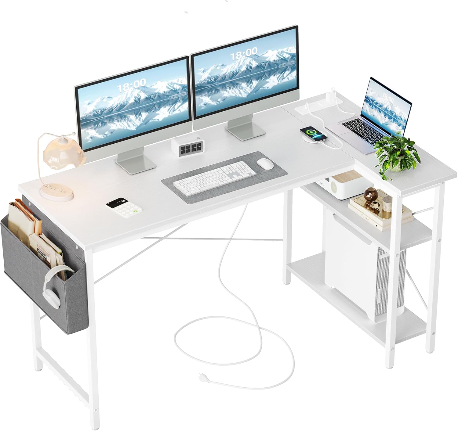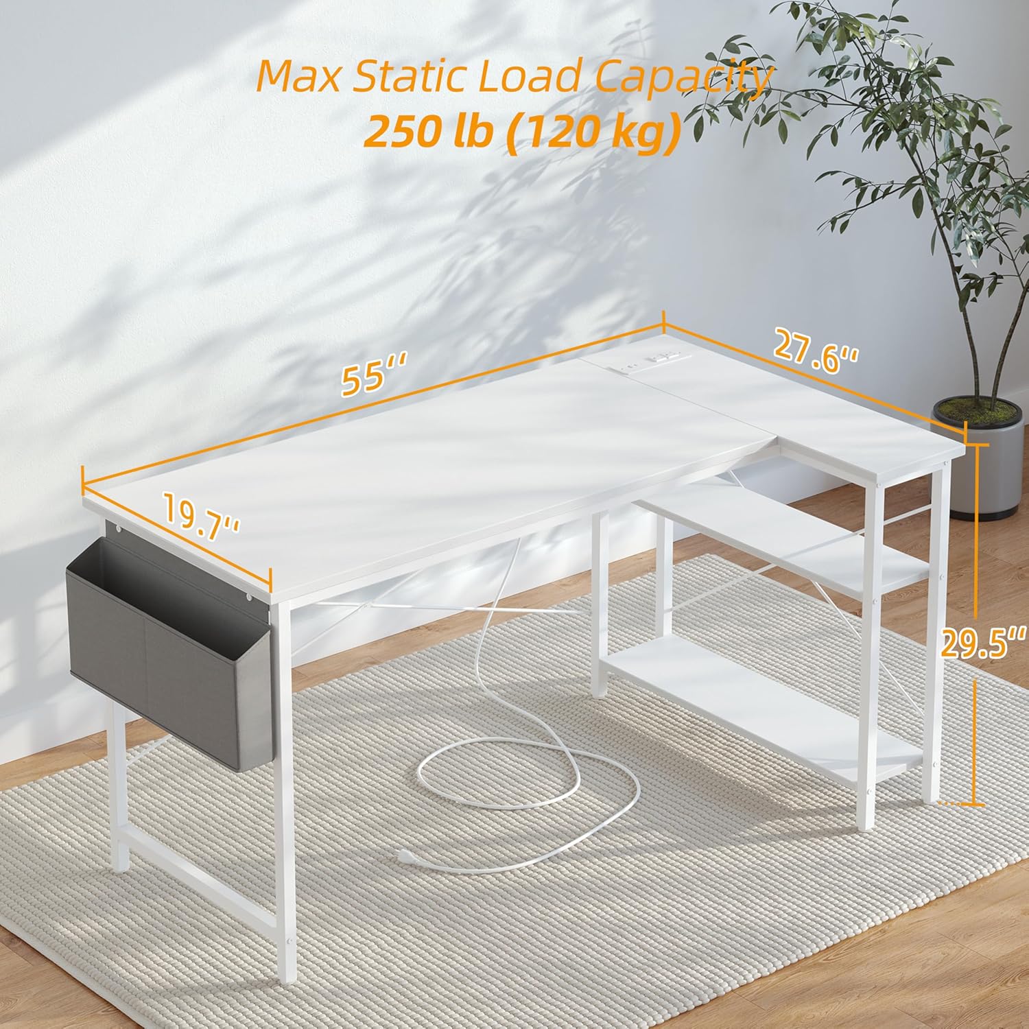 TIQLAB L Shaped Computer Desk with Power Outlets, 55 Inch Small Corner Desk with Reversible Shelves, Gaming Desk Computer Table Study Writing Desk for Home Office Small Space, White