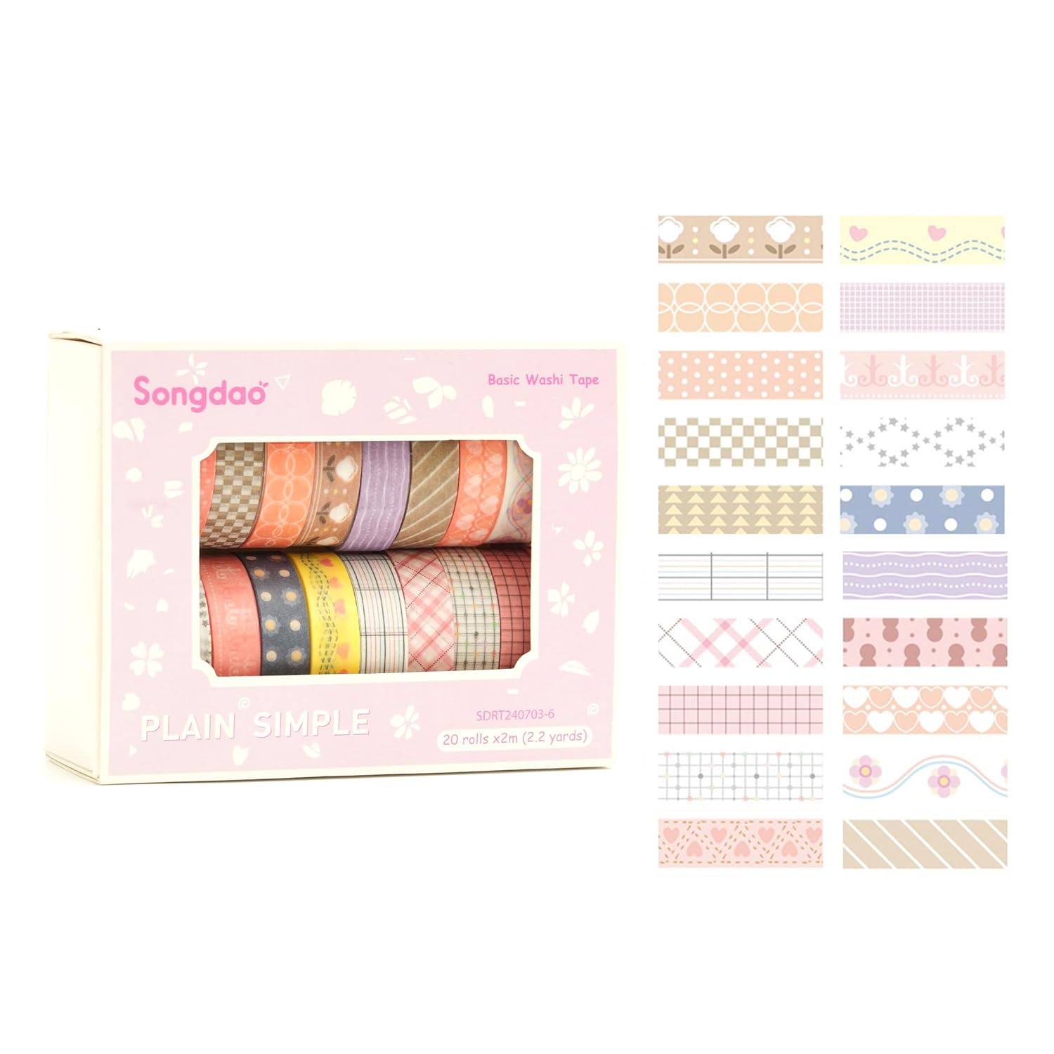 20 Rolls Basic Washi Tape Set Japanese Arts Adhesive Tapes Simple Patterns Decorative Masking Tape Sets for Craft, Kids, Scrapbook, DIY, Gift Wrapping (Style Six)