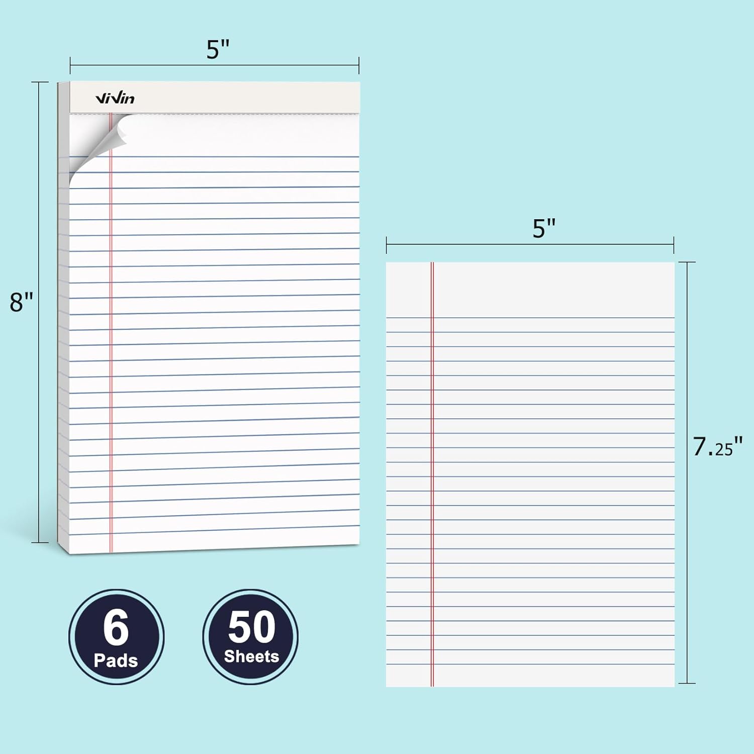 ViVin 5 x 8 Inch Legal Pads, 6 Pack, Narrow Ruled, 50 Sheets Per Writing Pad, Perforated Note Pads Ideal for Home, Office, Business, 300 Sheets, White Paper