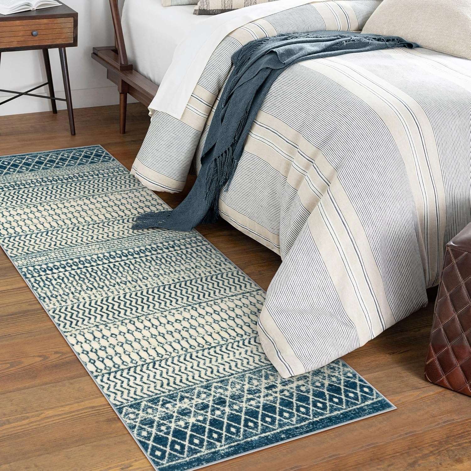 - 【Soft & Non-Shedding Rug】: The blue area rug is made of faux wool, soft cozy material is friendly to pets and children's skin.The low-pile blue rug features high density , pile almost non-shedding.The ultra soft touch protects your feet from the cold and hard floors, bringing comfort and warmth to your feet