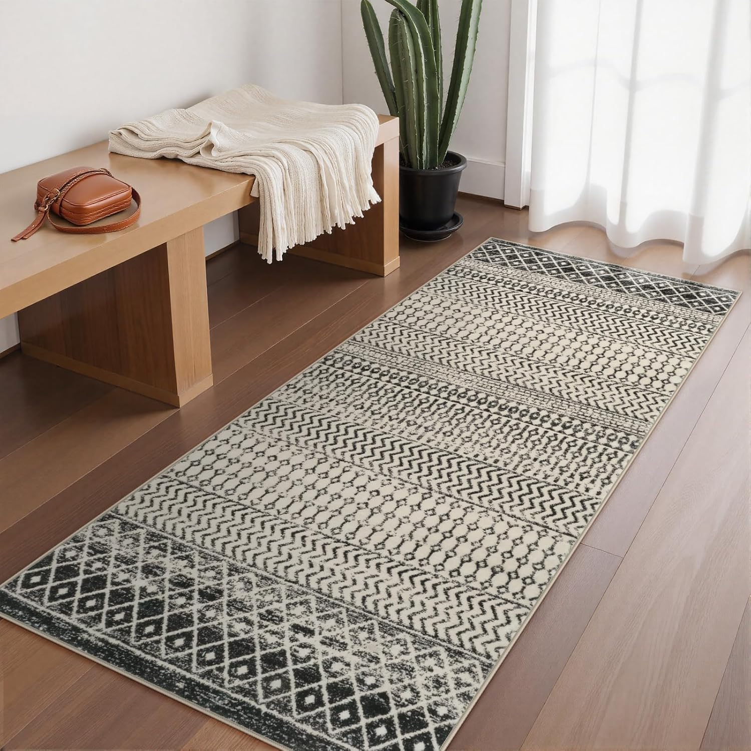 - 【Trendy Moroccan Design Rug】: This farmhouse rug is designed with a Moroccan style pattern using a combination of geometric lines and shapes.The slight vintage feel created by the beige and black distressed tones helps to establish a nostalgic atmosphere.The bohemian rugs for bedroom aesthetic,ideal for promoting a cozy and inviting feel to your space