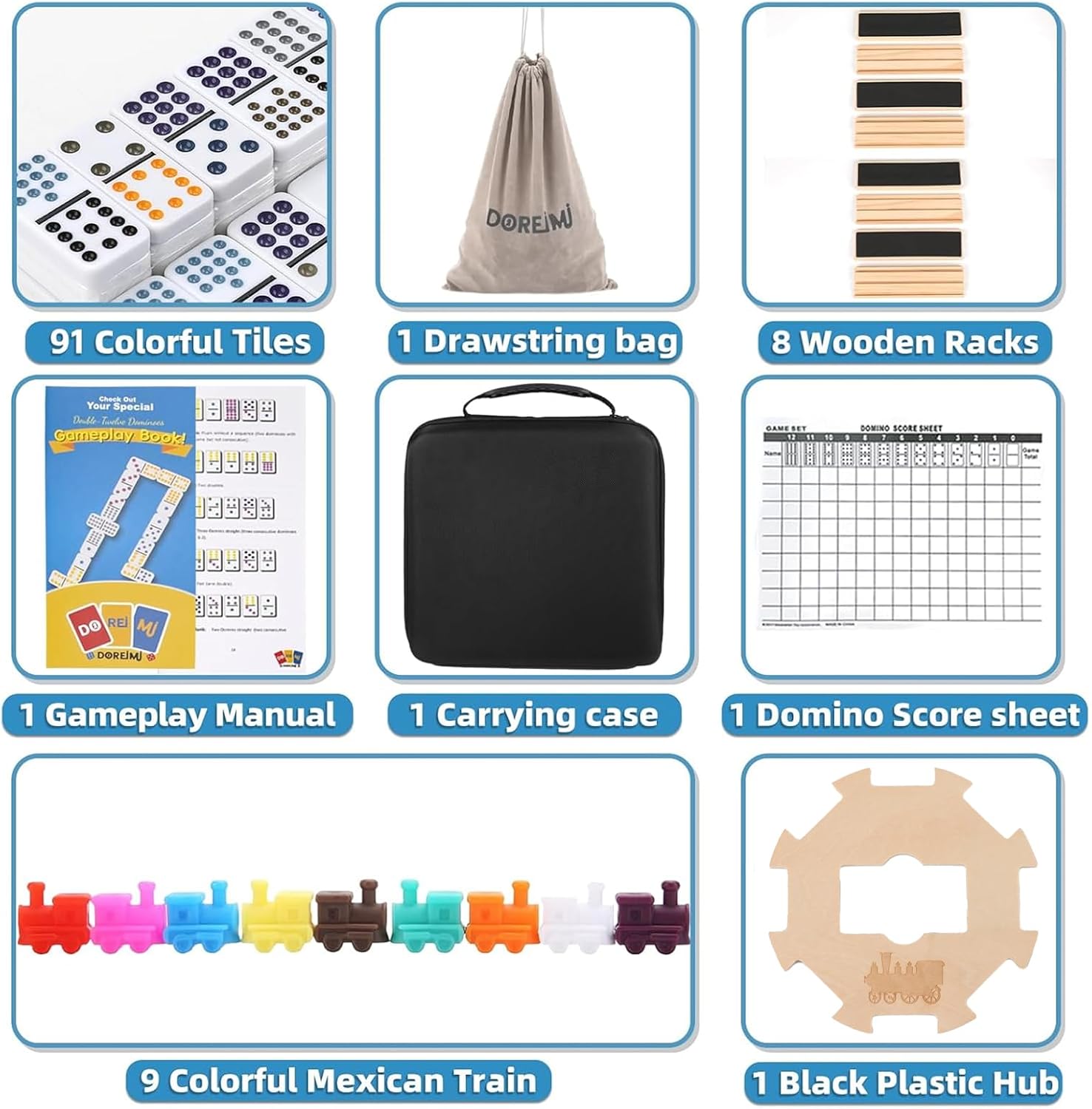 - 8 in 1 Mexican Dominoes Set: This domino board game Set is designed with 91 dot domino tiles, 8 travel holders, 1 EVA case, 1 drawstring bag, 9 trains, 1 exclusive game manual, 1 scorebook and 1 hub