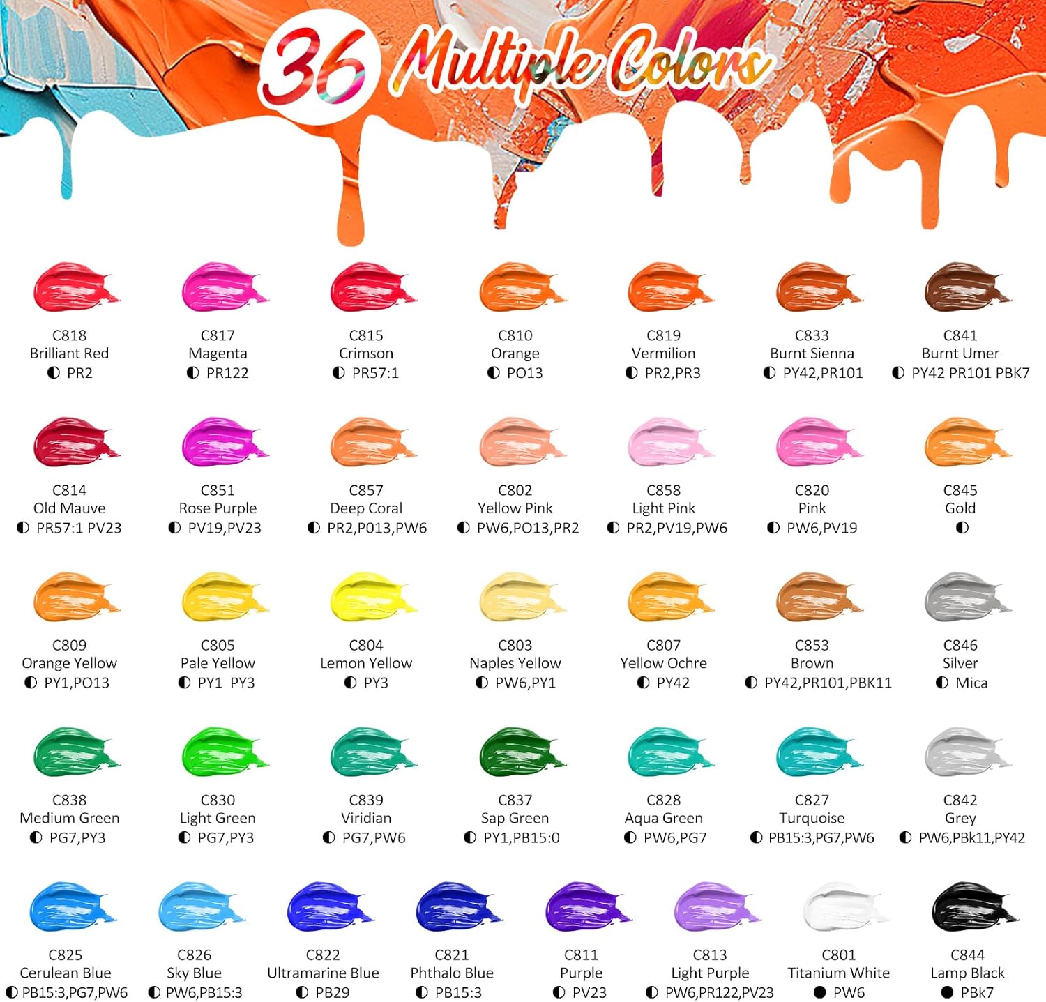 - This art acrylic painting kit comes with 36-pack, 2 oz / 59ml bottles in the classic colors set fire to your imagination. Premium acrylic paint kit features smooth, highly pigmented color to produce true, consistent shades.