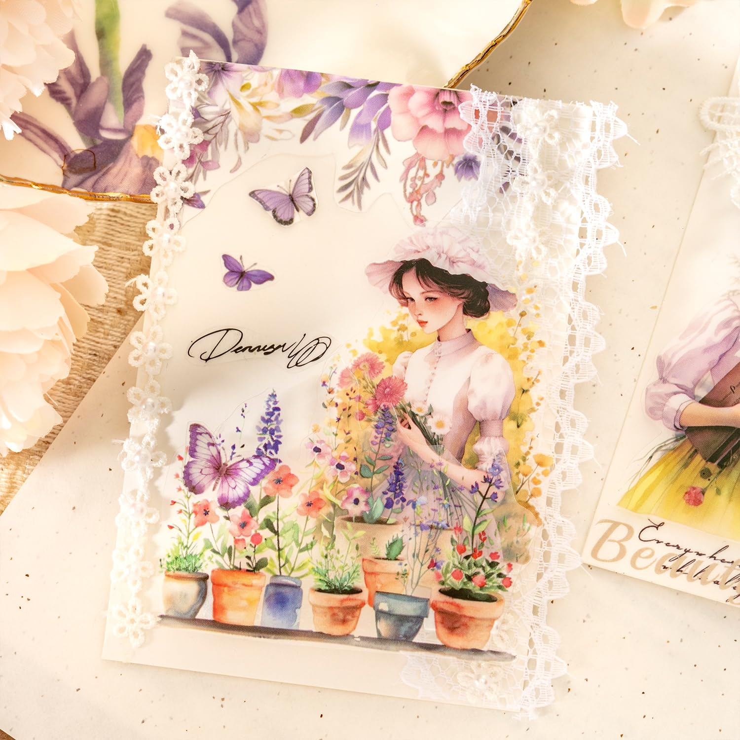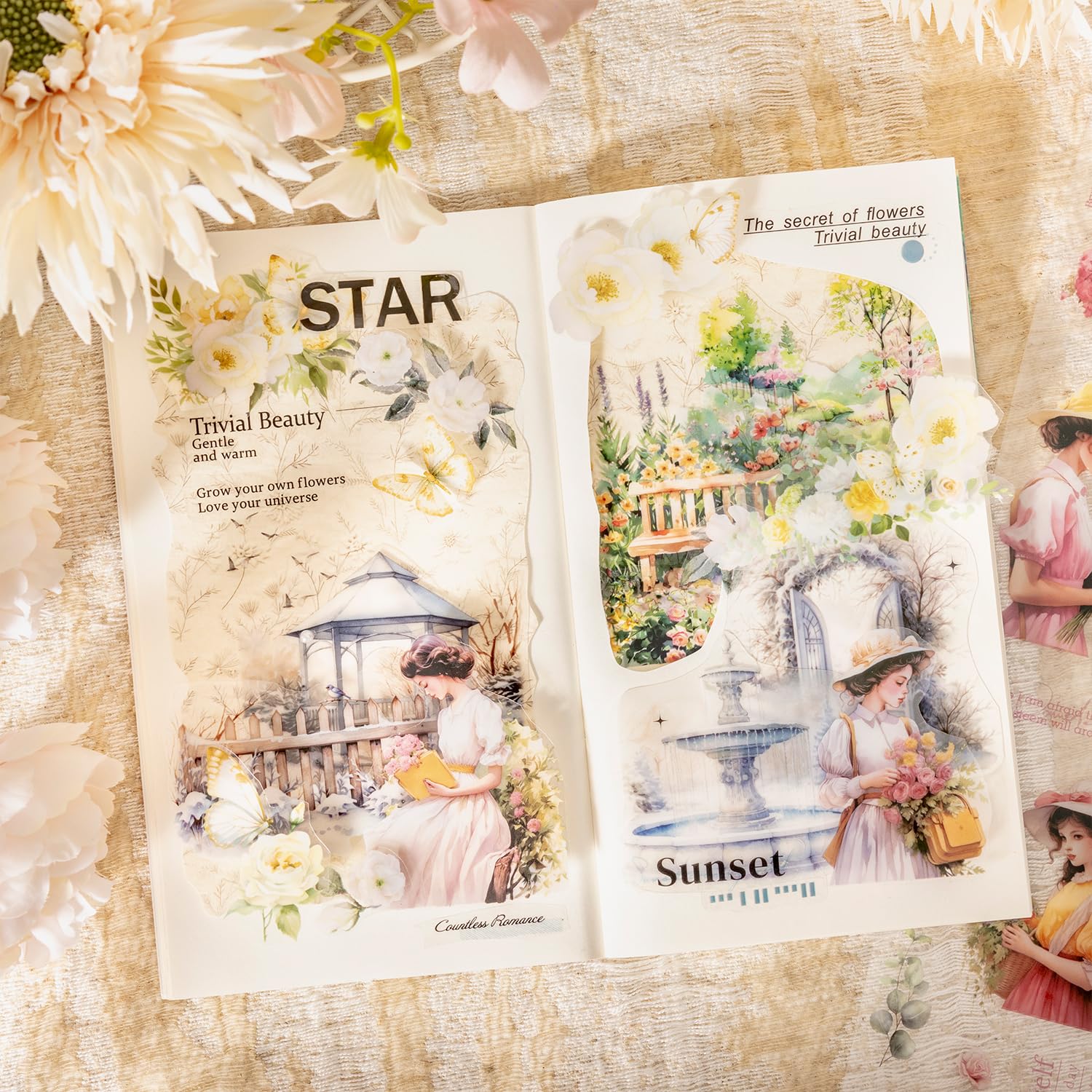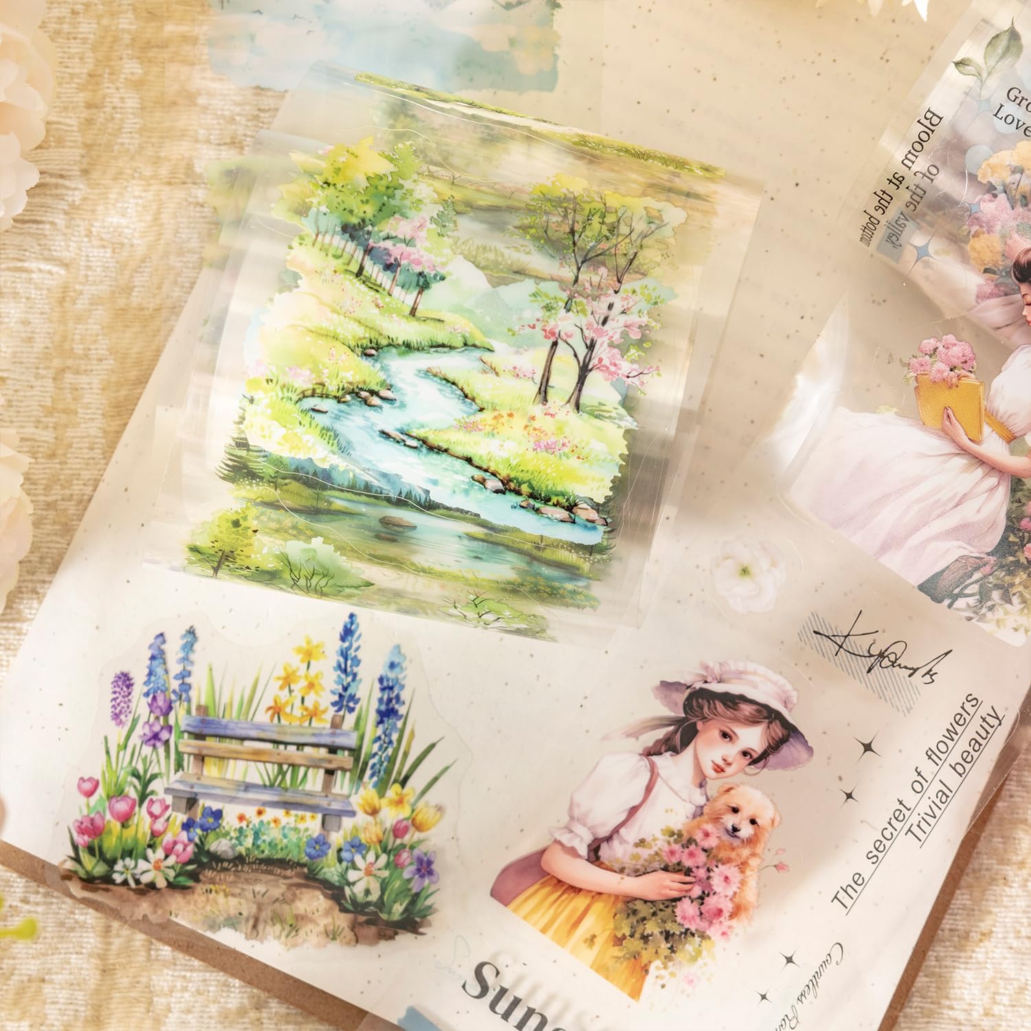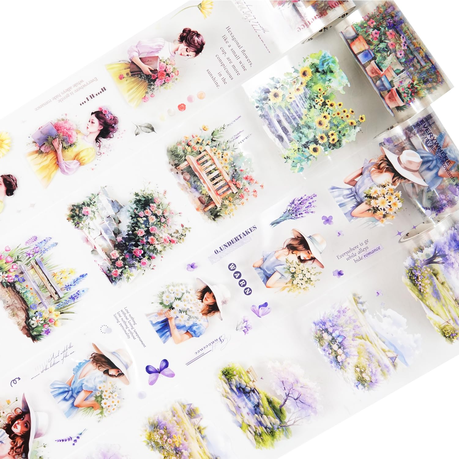 - Beautiful Scenic and Floral Designs: This set includes 4 pre-cut PET tapes featuring vibrant floral gardens and elegant girl portraits, making them ideal for adding a creative and colorful touch to scrapbooks, journals, and various DIY craft projects