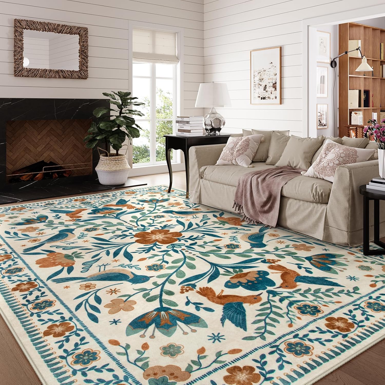 Morebes Floral 9x12 Area Rug for Living Room, Washable Large Rug for Bedroom Non Slip, Soft Boho Vintage Flower Birds Distressed Throw Carpet for Dinning Room Playroom, Beige/Multi